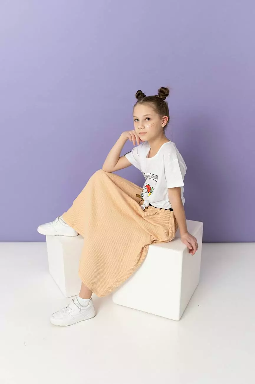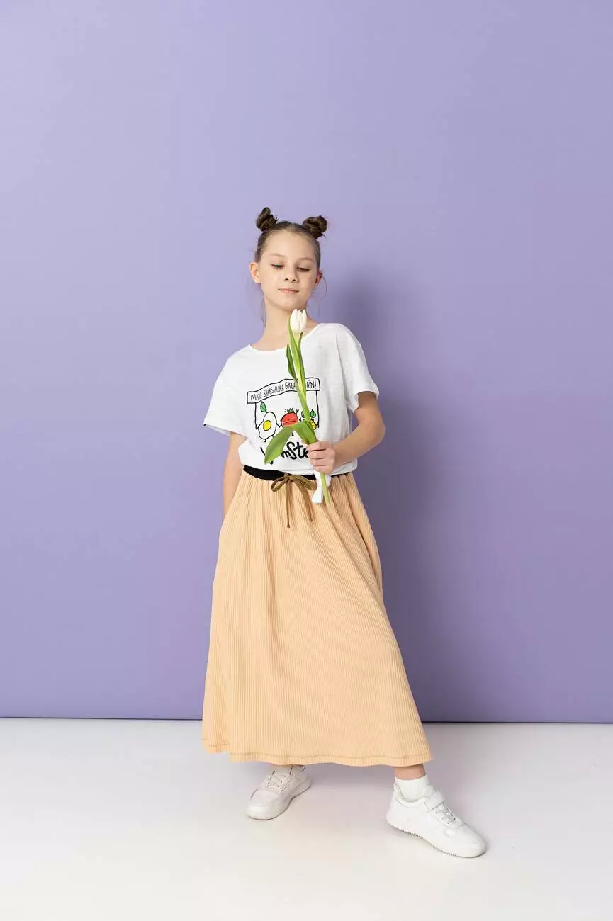 Стильна дитяча спідниця нижче колін персикового кольору. Для дівчаток від 5 до 15 років.