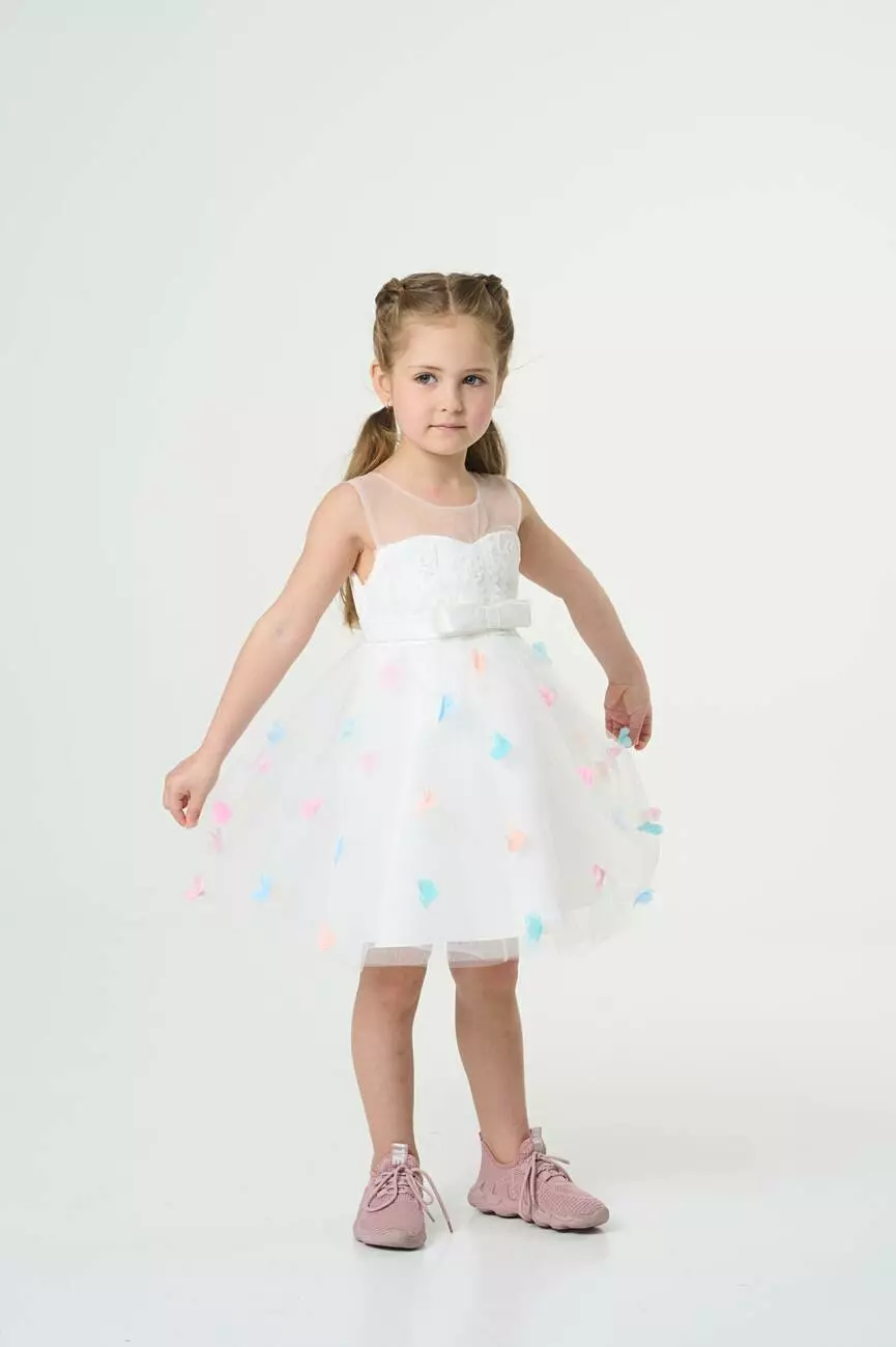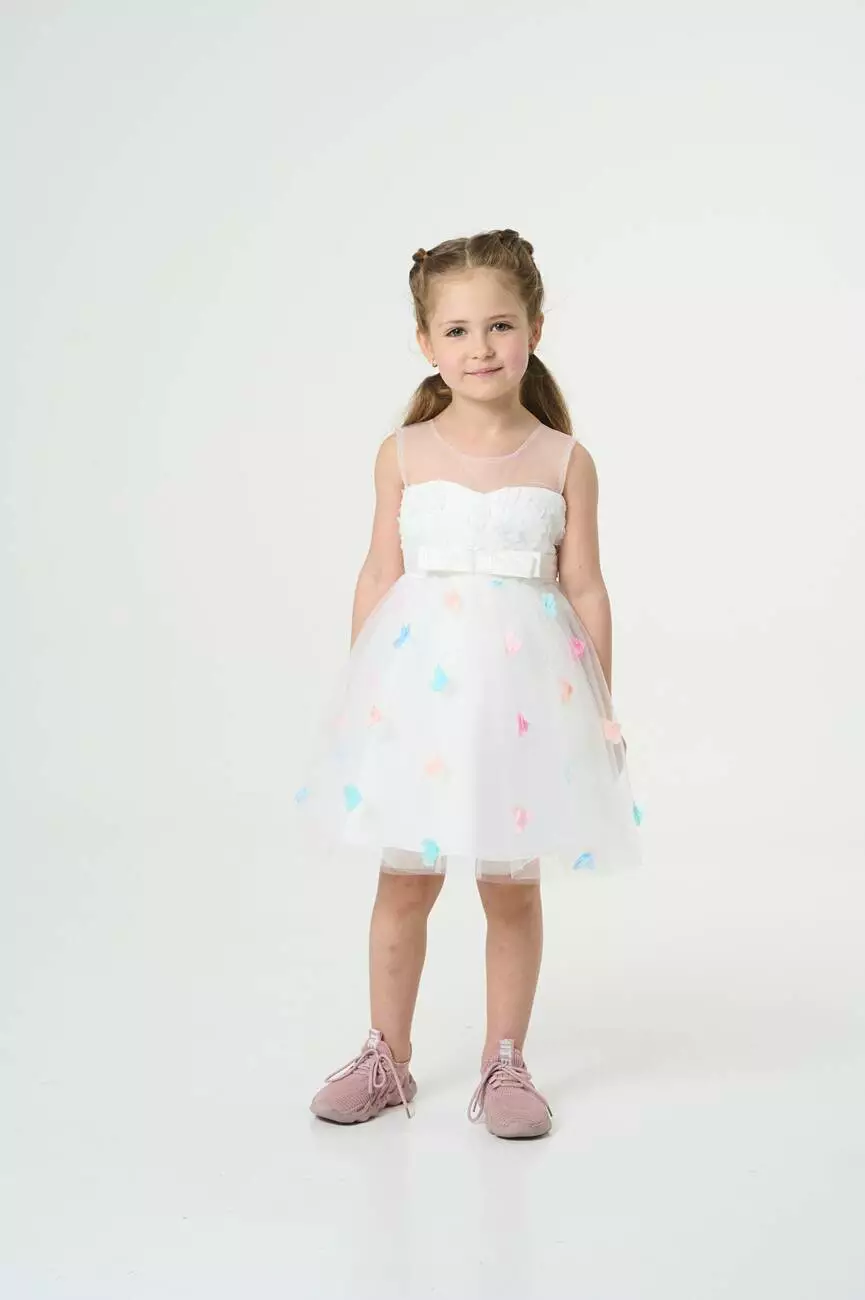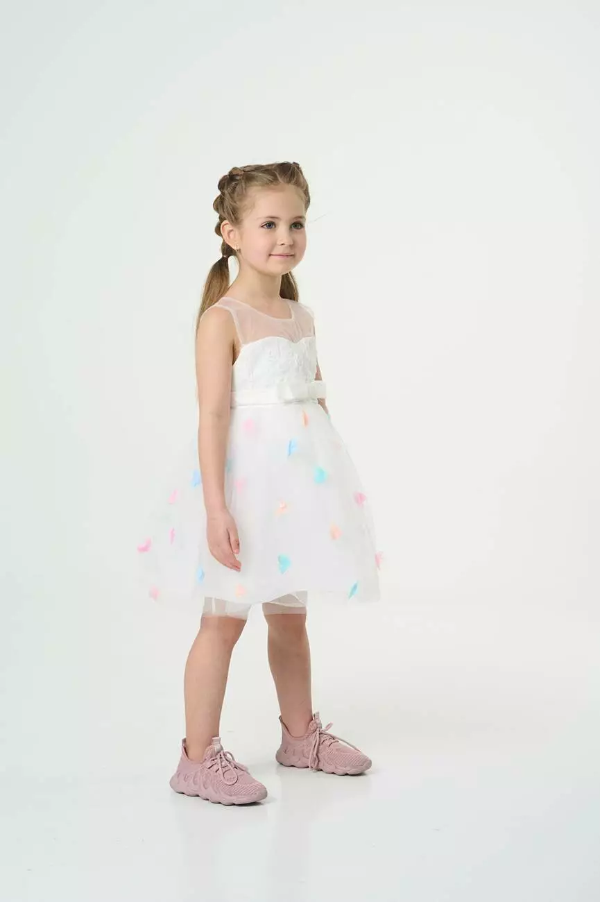 Деталі моделі: колір сукні – білий. Кругла горловина. Без рукавів. Верх топа – відрізна кокетка з євросітки. Застібка – блискавка на спинці. Ліф сукні прикрашений трояндами в тон. Атласний пояс має спереду фіксований бант, а ззаду зав'язується на бант. Нижній шар спідниці – непрозора тканина. Верхній шар спідниці – євросітка, декорована кольоровими квіточками. Довжина сукні – до колін.