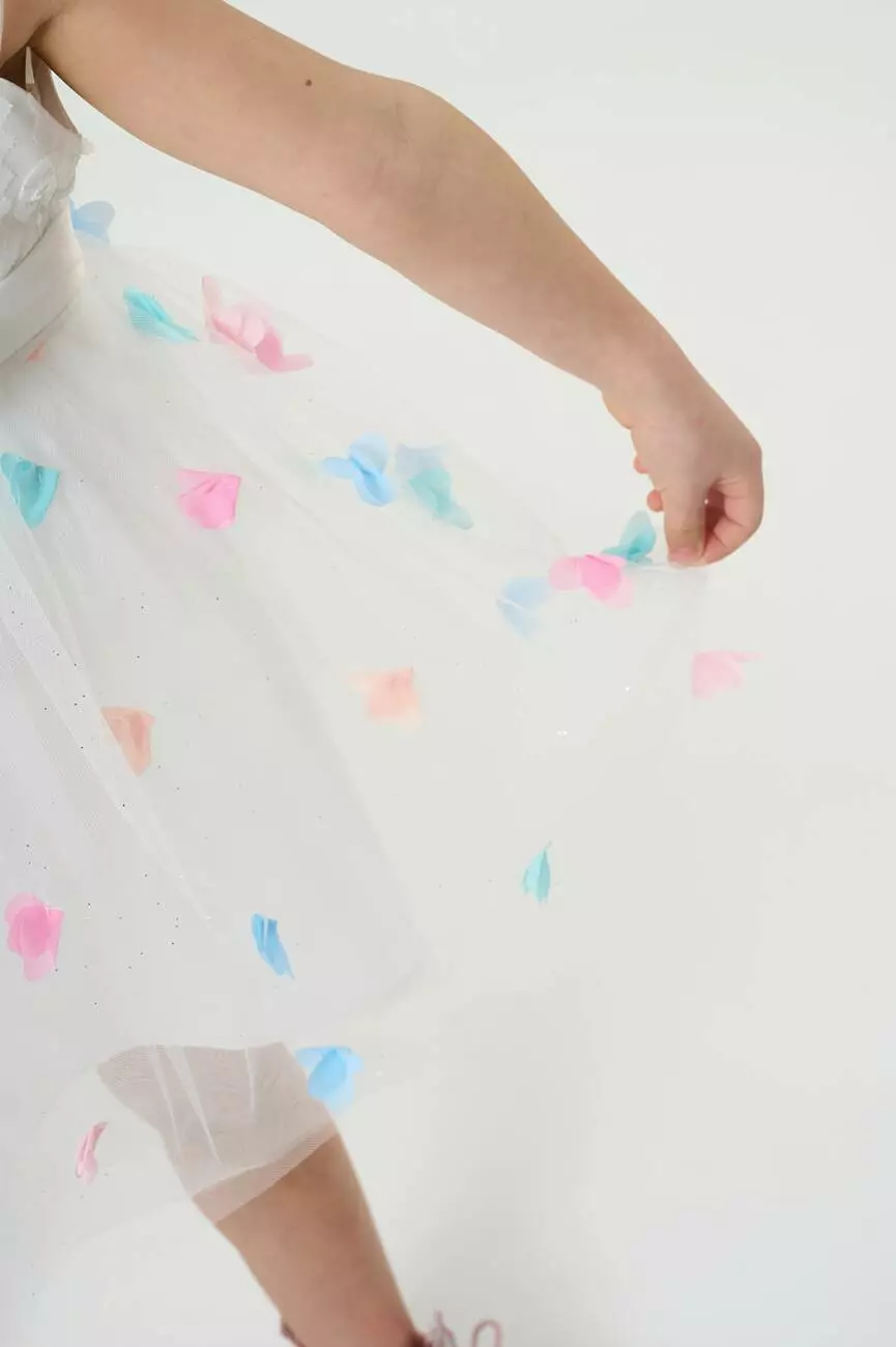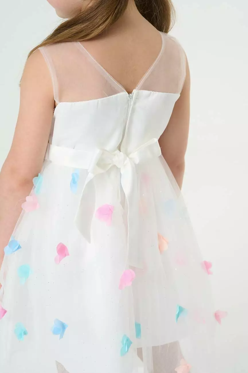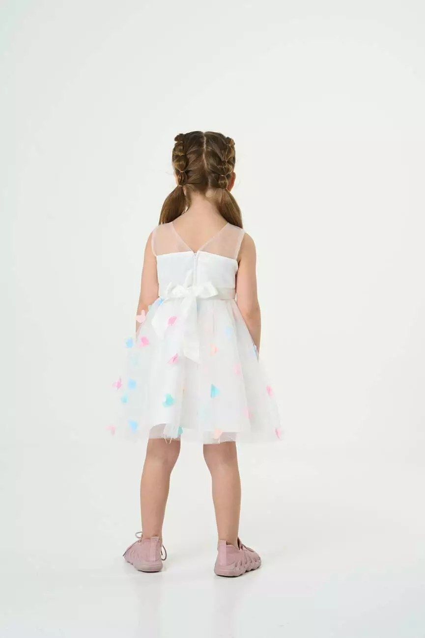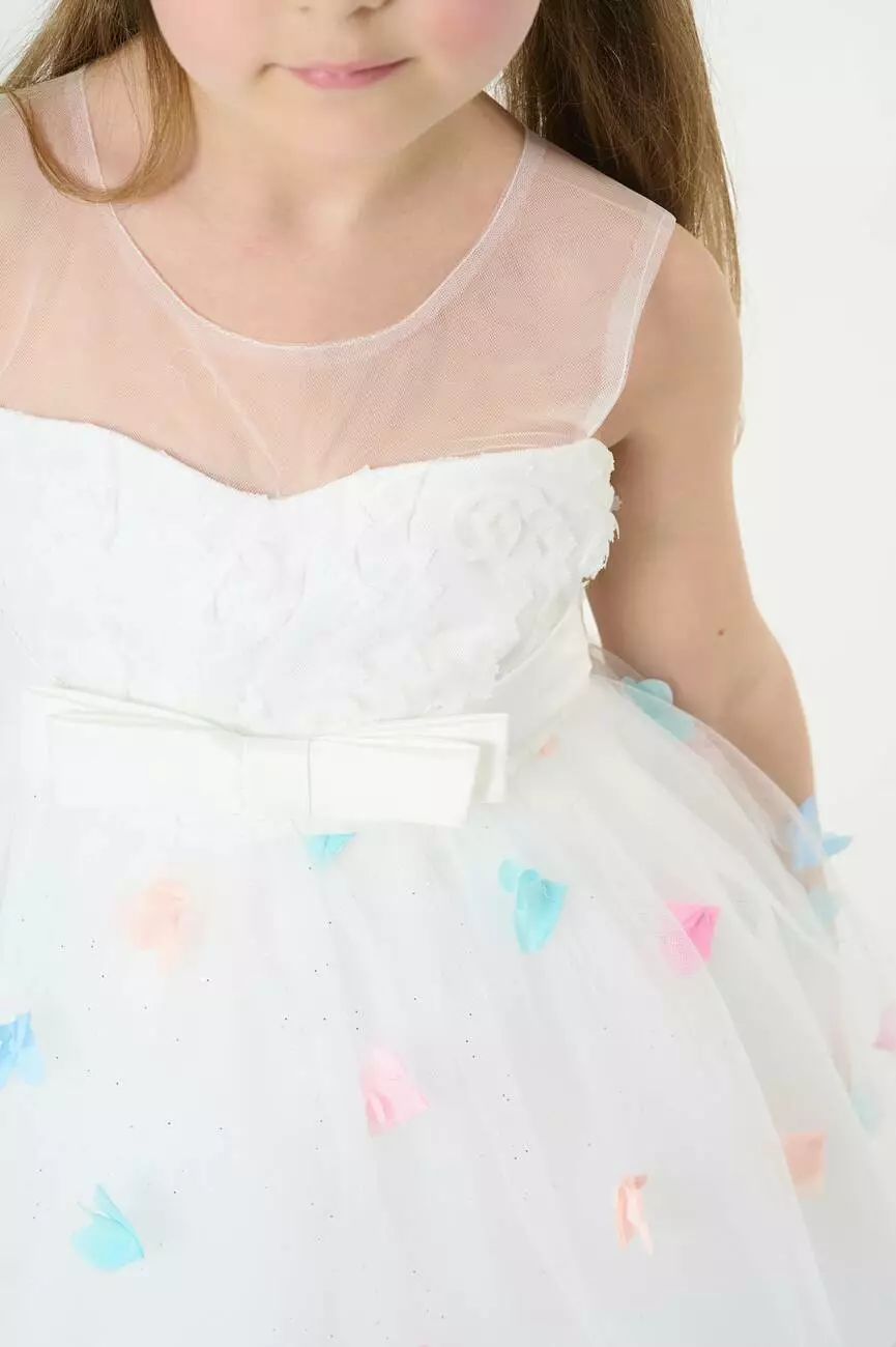 Деталі моделі: колір сукні – білий. Кругла горловина. Без рукавів. Верх топа – відрізна кокетка з євросітки. Застібка – блискавка на спинці. Ліф сукні прикрашений трояндами в тон. Атласний пояс має спереду фіксований бант, а ззаду зав'язується на бант. Нижній шар спідниці – непрозора тканина. Верхній шар спідниці – євросітка, декорована кольоровими квіточками. Довжина сукні – до колін.