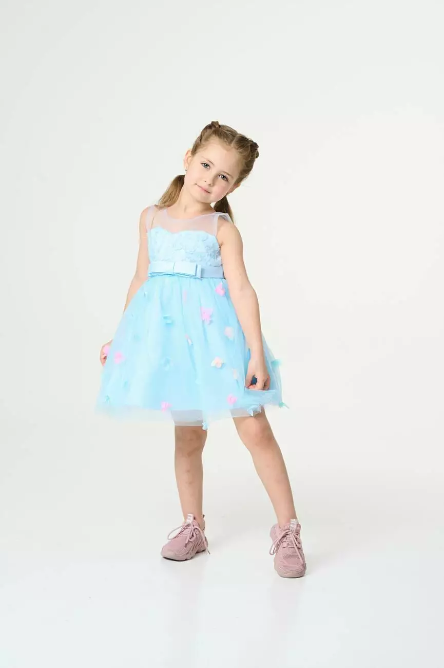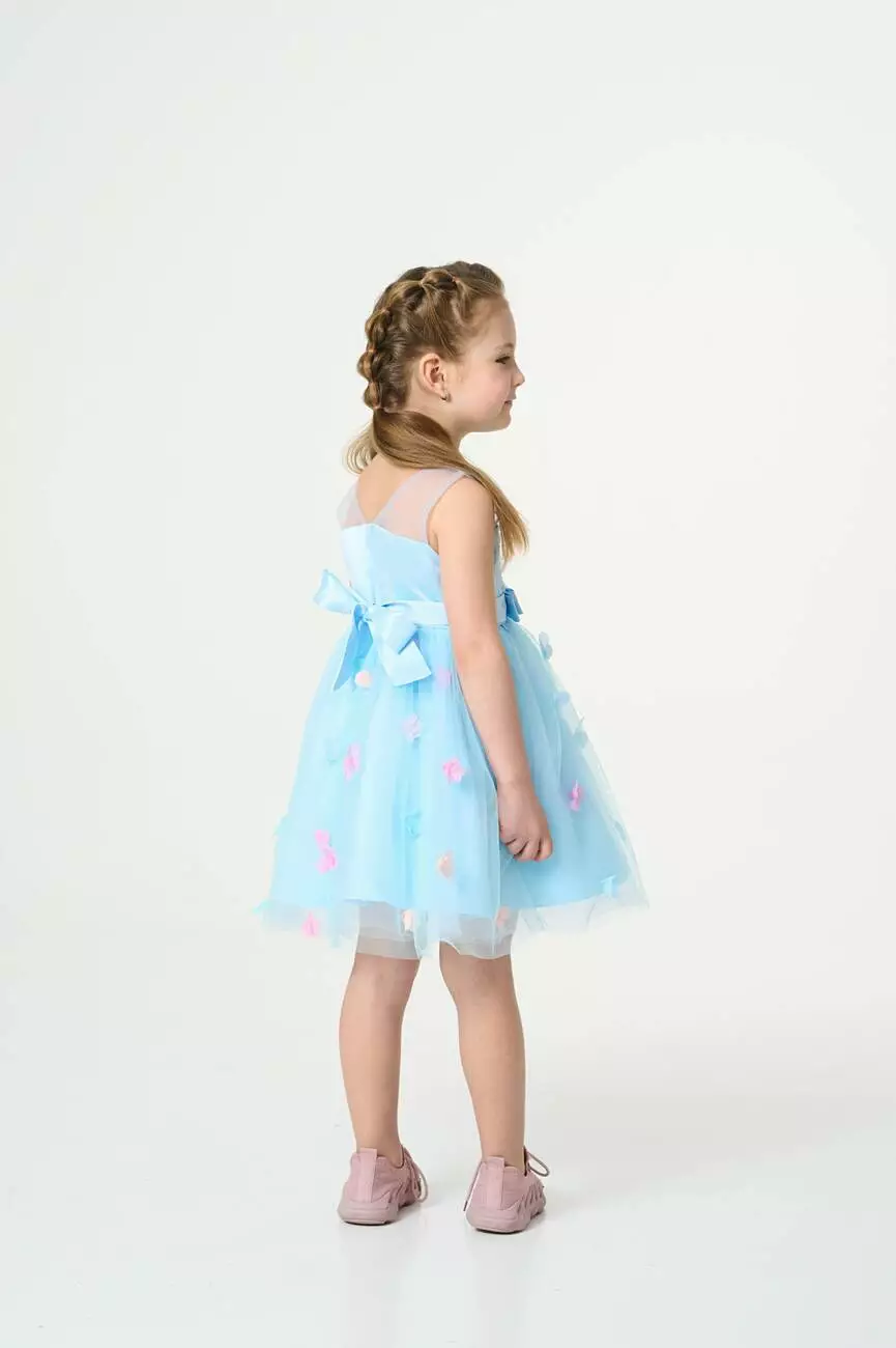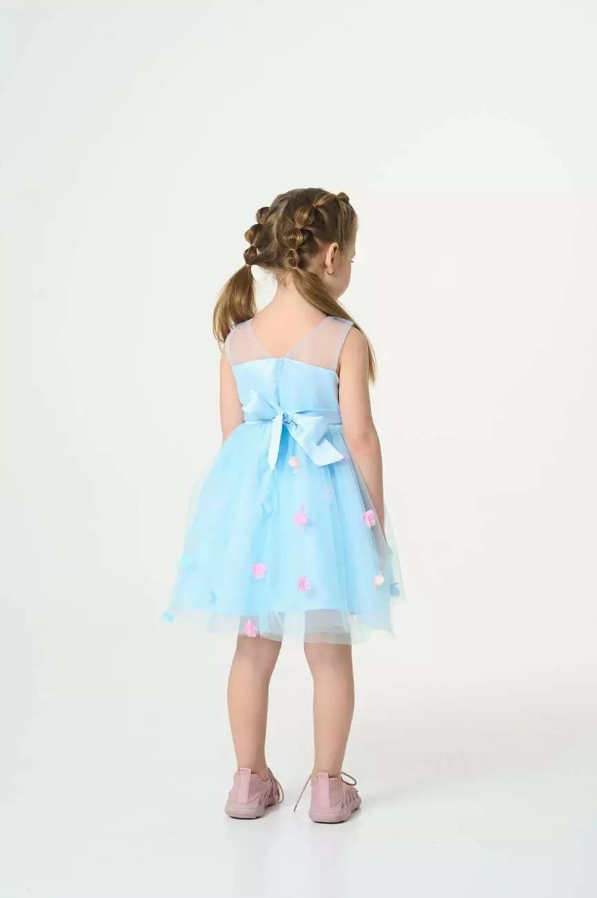 Деталі моделі: колір сукні – блакитний. Кругла горловина. Без рукавів. Верх топа – відрізна кокетка з євросітки. Застібка – блискавка на спинці. Ліф сукні прикрашений трояндами в тон. Атласний пояс має спереду фіксований бант, а ззаду зав'язується на бант. Нижній шар спідниці – непрозора тканина. Верхній шар спідниці – євросітка, декорована кольоровими квіточками. Довжина сукні – до колін.