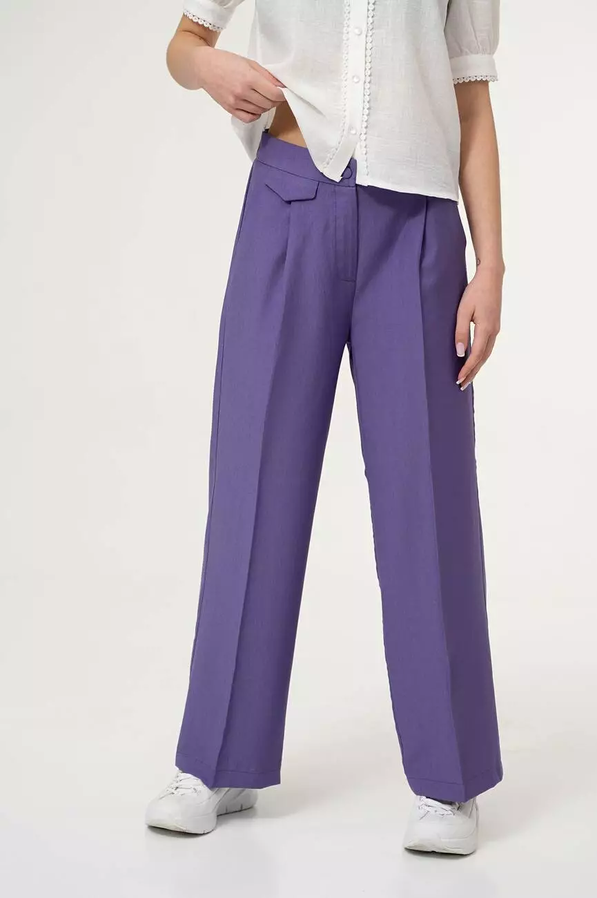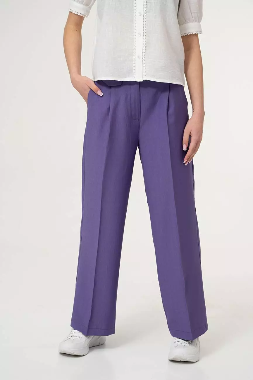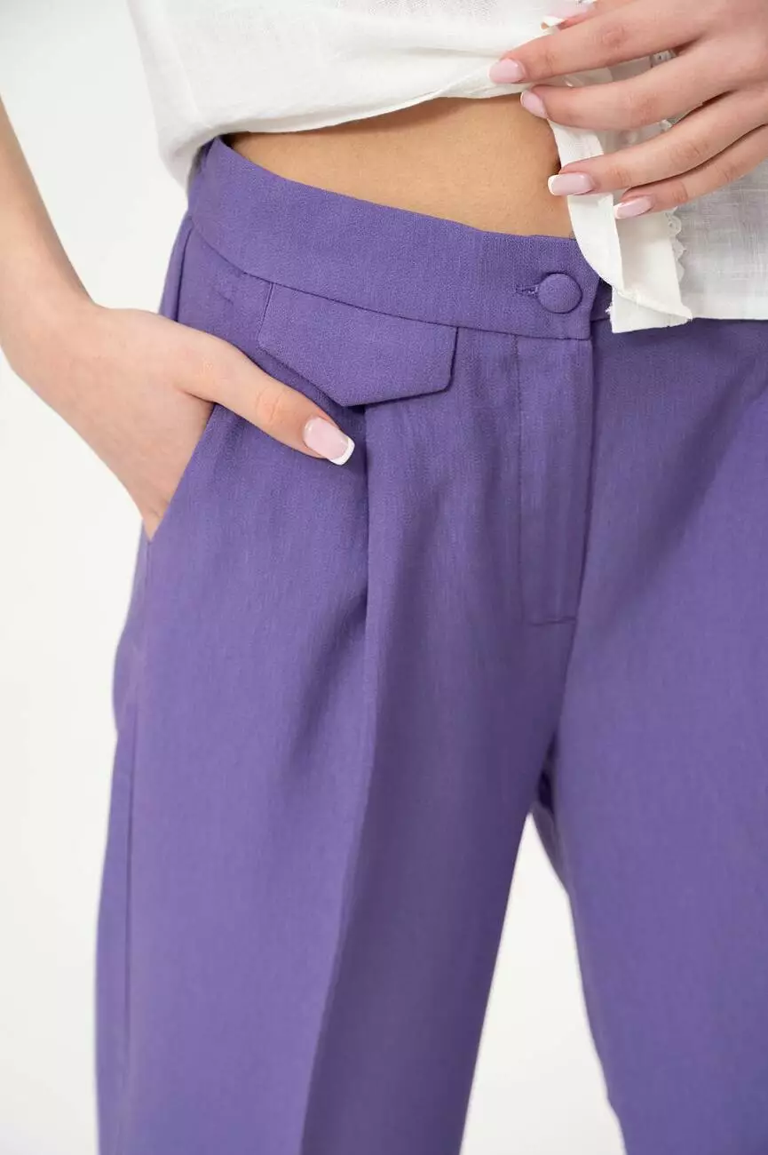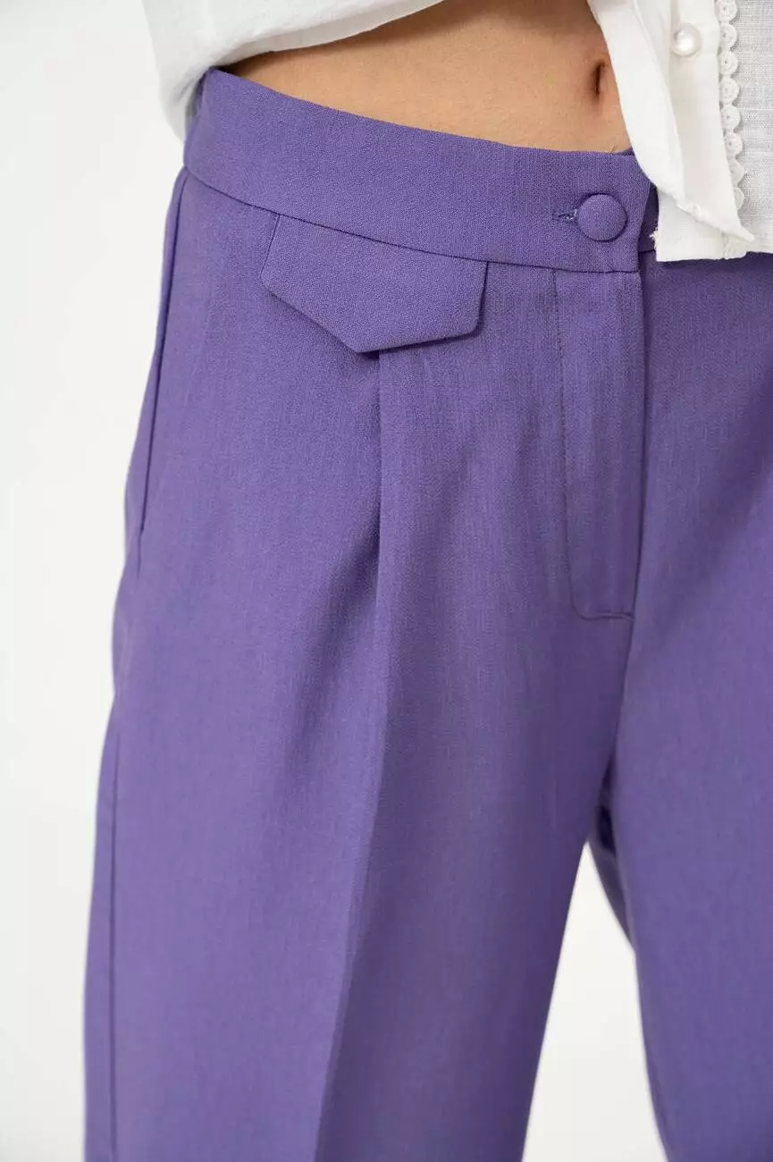 Деталі моделі: однотонні брюки, лавандового кольору. Середня висота посадки. На поясі ззаду збірка з резинки. Є шльовки для ремінця. Застібка – блискавка. Дві бічні кишені з відрізним бочком. По всій довжині брючини спереду та ззаду стрілки. Матеріал - котон. Сезон - весна, літо та тепла осінь.