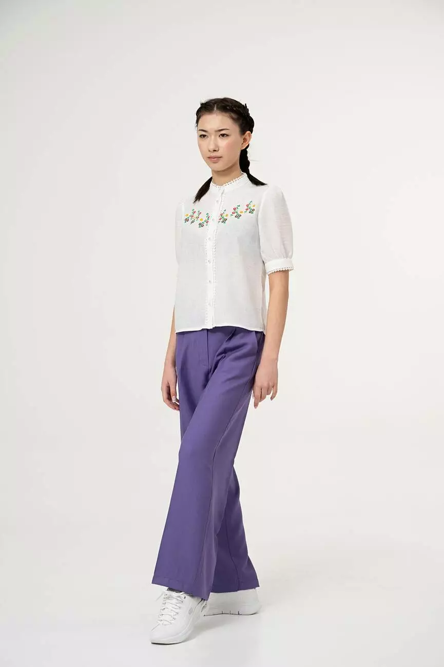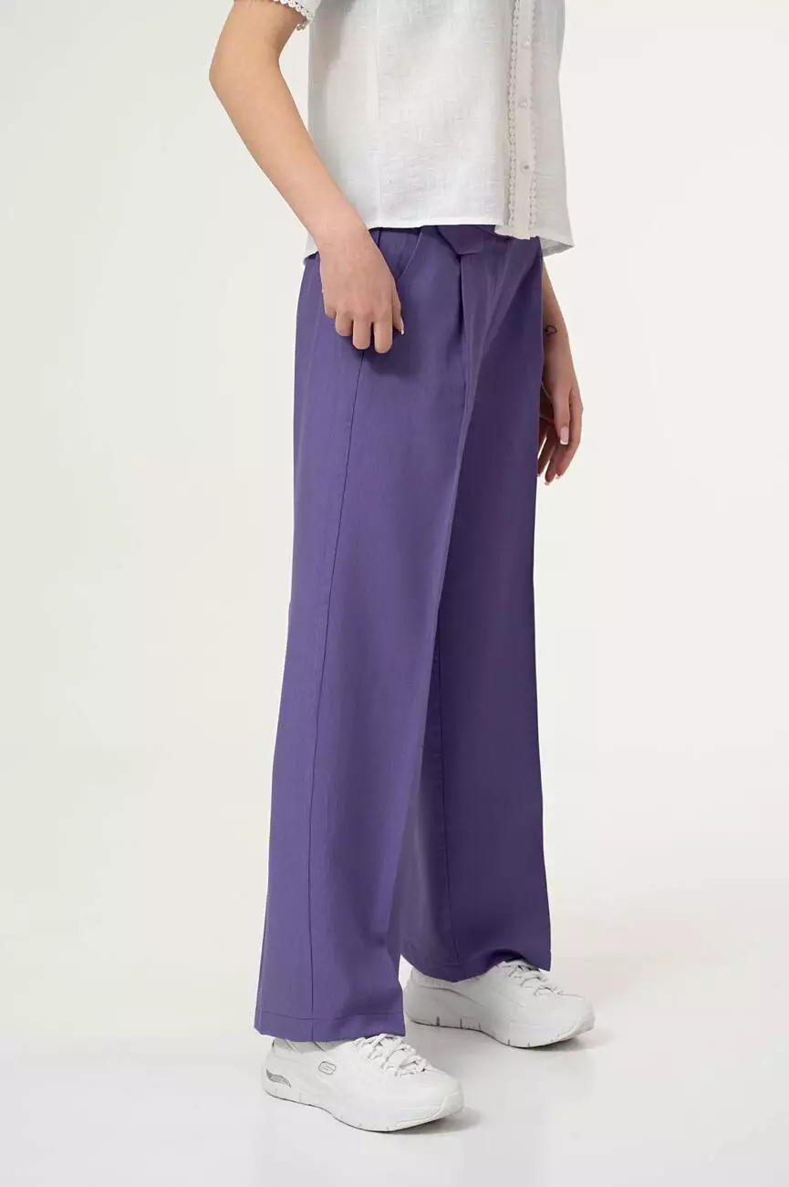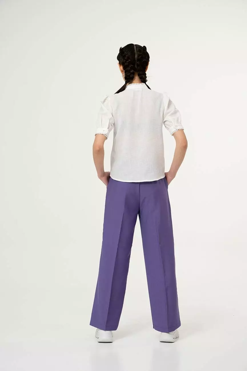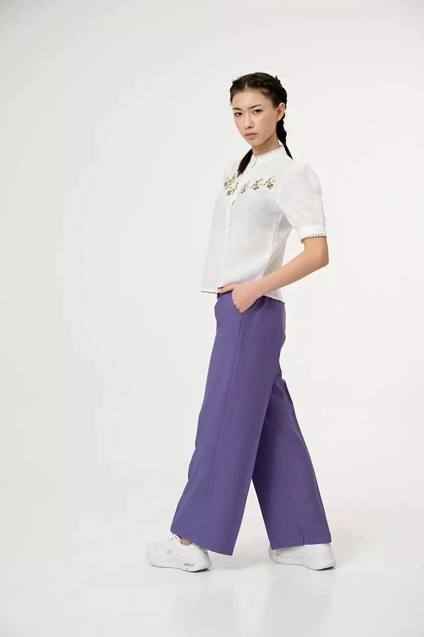 Деталі моделі: однотонні брюки, лавандового кольору. Середня висота посадки. На поясі ззаду збірка з резинки. Є шльовки для ремінця. Застібка – блискавка. Дві бічні кишені з відрізним бочком. По всій довжині брючини спереду та ззаду стрілки. Матеріал - котон. Сезон - весна, літо та тепла осінь.