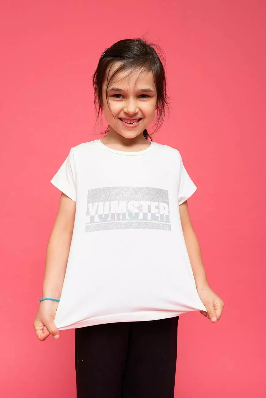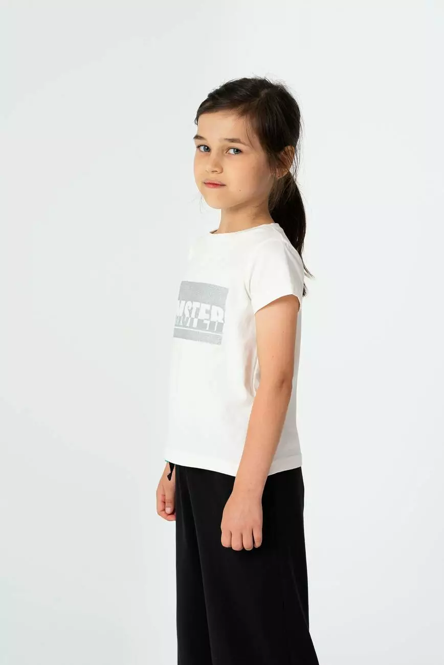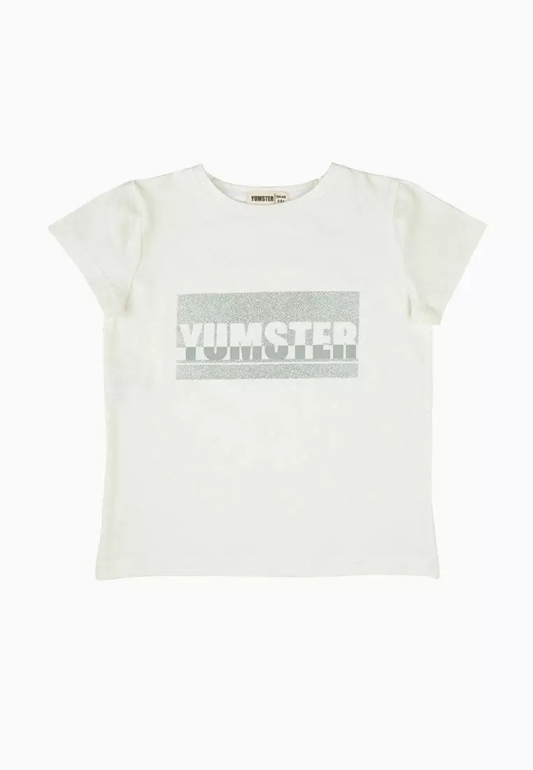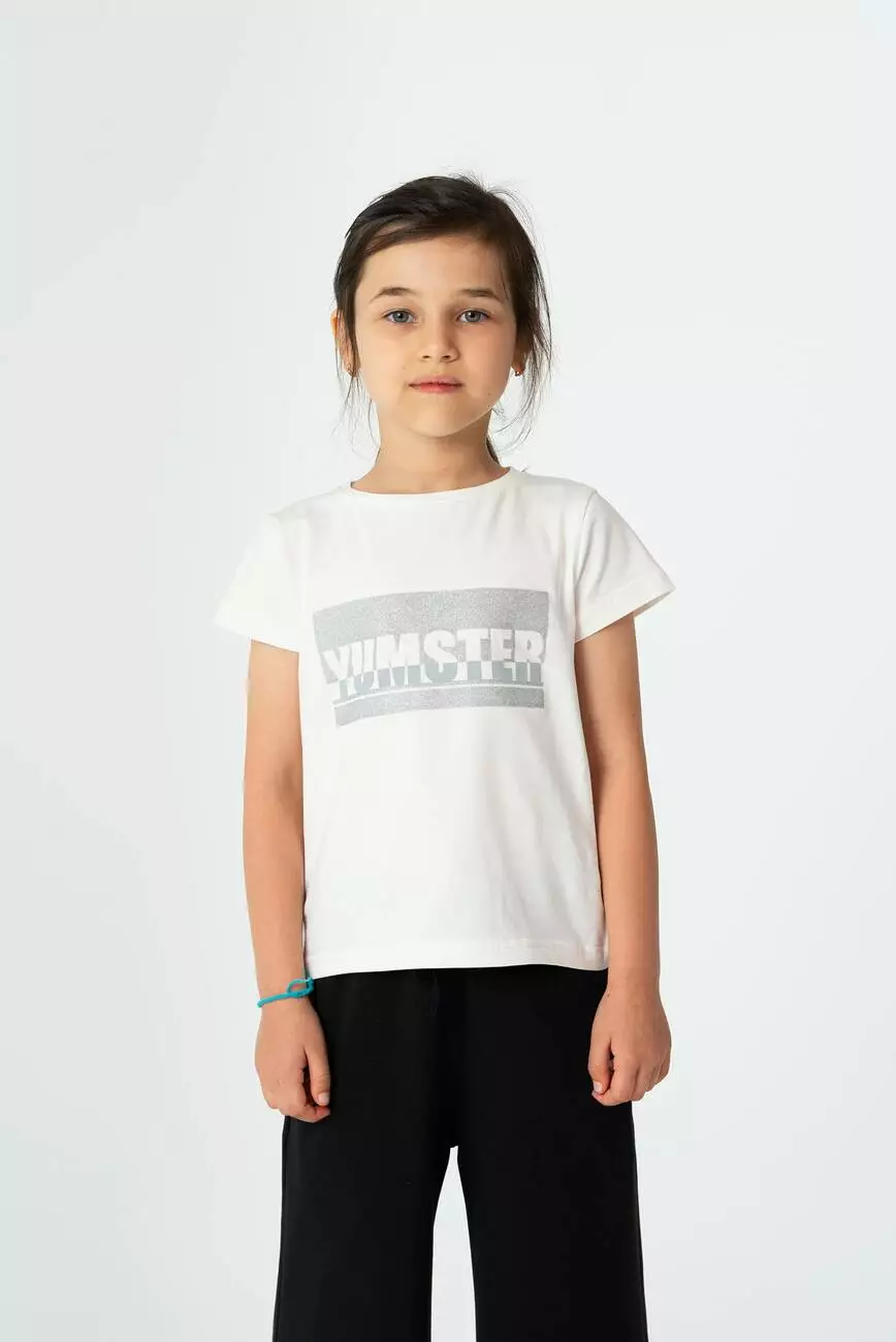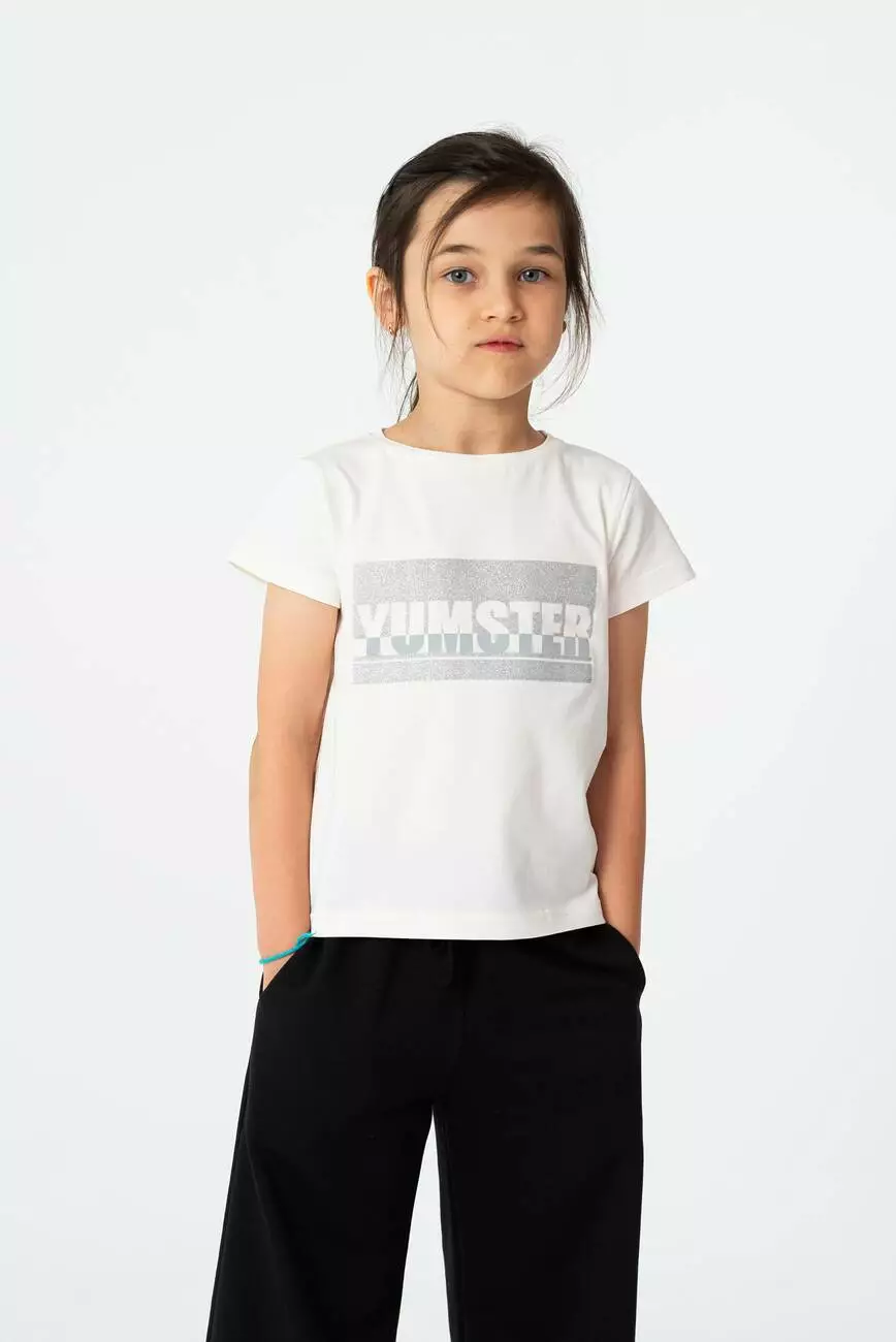 Деталі моделі: Футболка молочного кольору. Напівприлягаючого силуету, з глітерним принтом Yumster на грудях. Кругла горловина, короткий рукав. Матеріал - кулір.