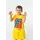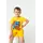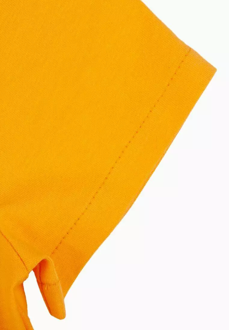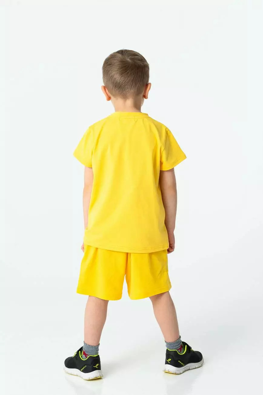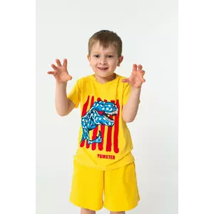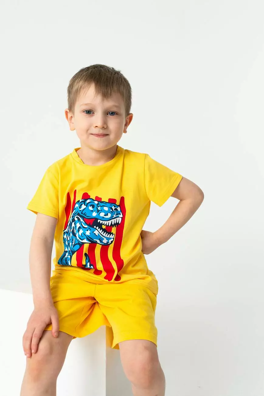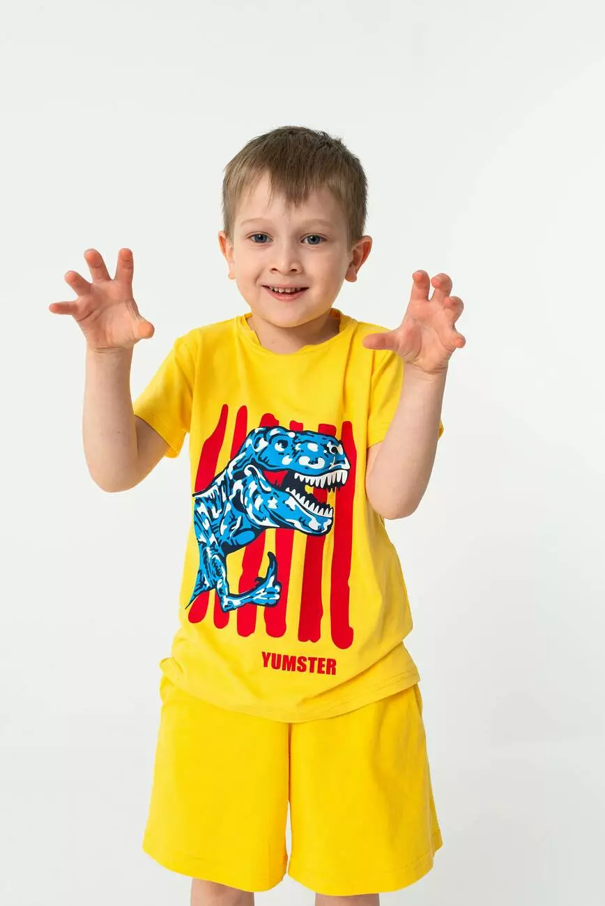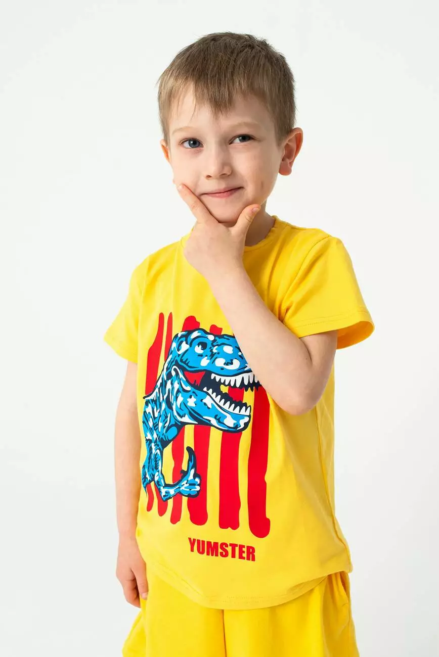 Деталі моделі: Футболка жовтого кольору. Кругла горловина. Короткий рукав. На грудях принт Динозавр. Фасон футболки - прямий крій. Тканина - котон.