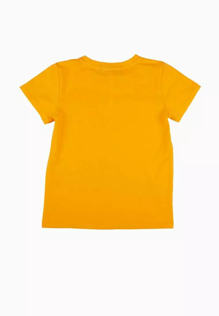 Деталі моделі: Футболка жовтого кольору. Кругла горловина. Короткий рукав. На грудях принт Динозавр. Фасон футболки - прямий крій. Тканина - котон.