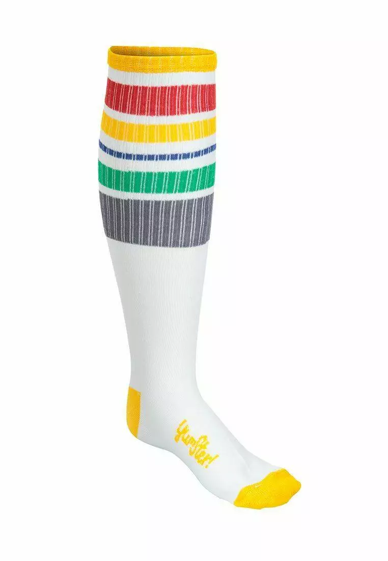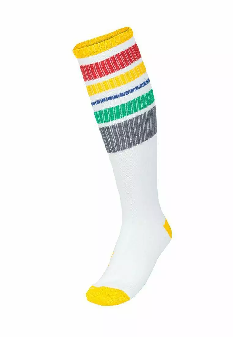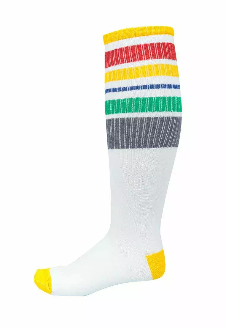 Високі шкарпетки (гольфи) білого кольору з різнокольоровими полосками. Для дівчаток від 5 до 15 років. Якісна тканина і резинка. Не втрачає форму і колір після прання.