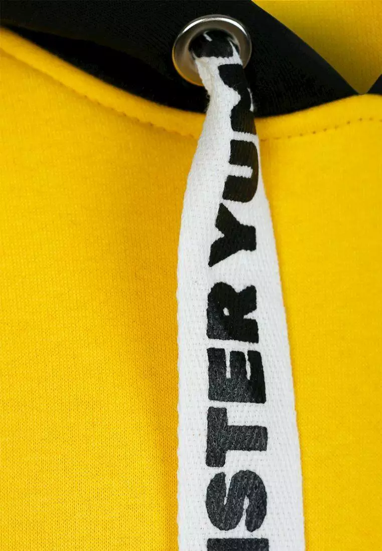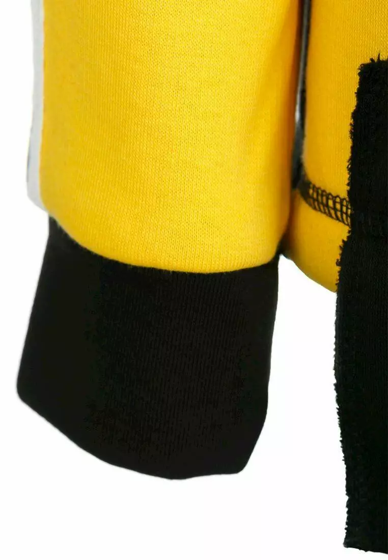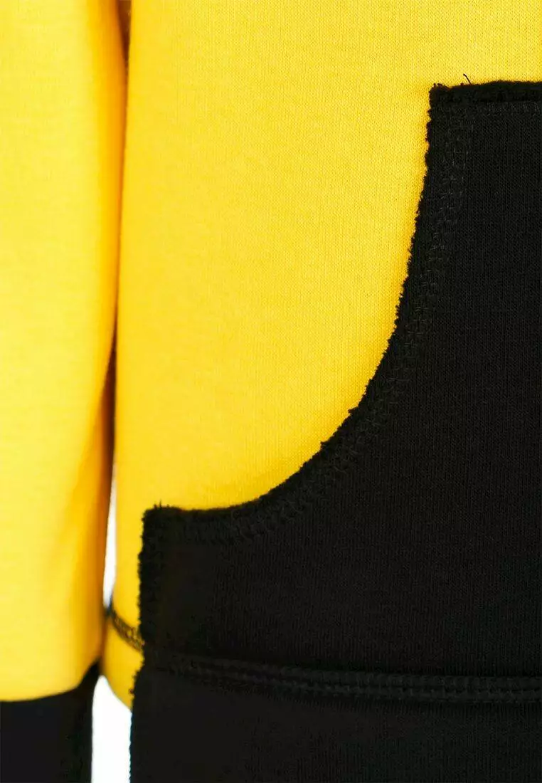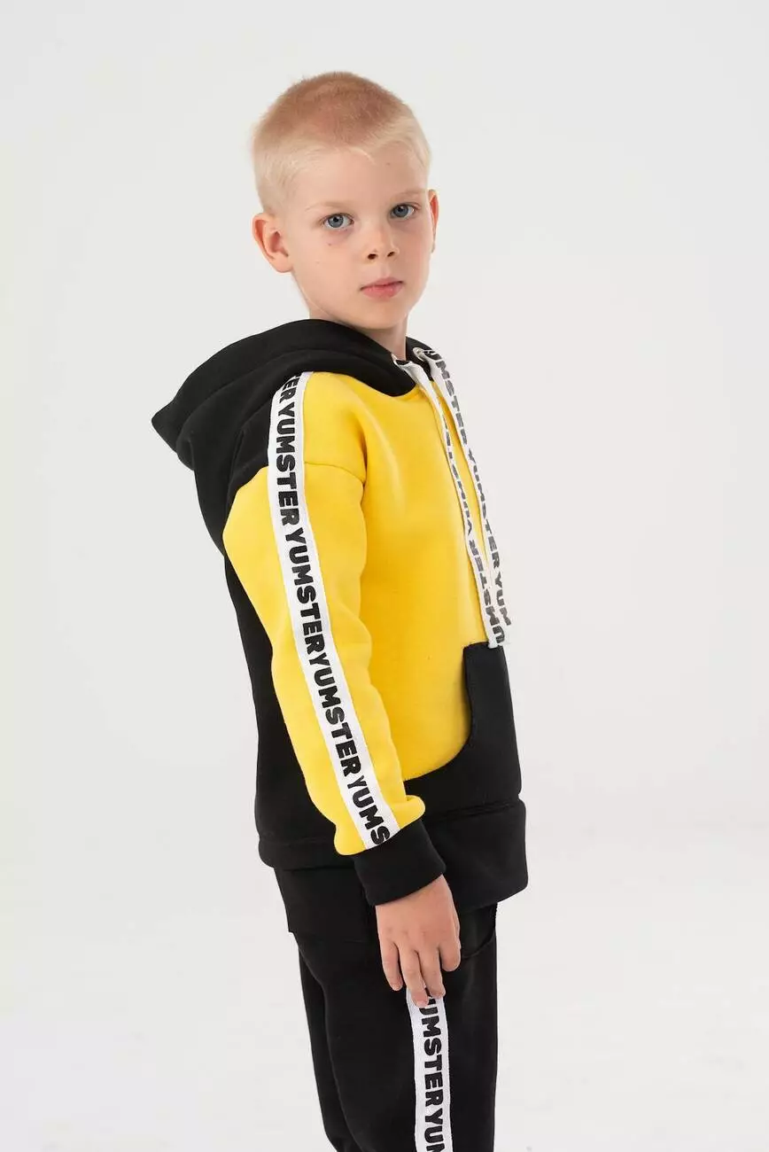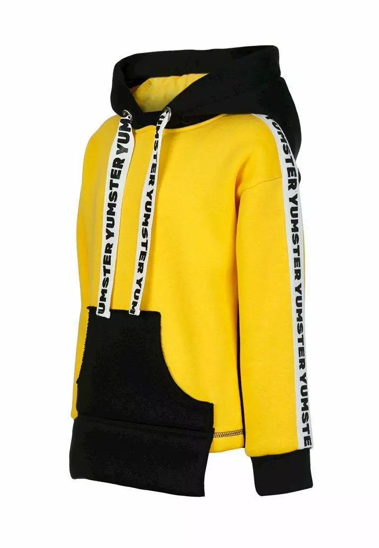 Деталі: Худі жовто-чорного кольору. Накладні кишені спереду. Глибокий капюшон. Резинка на манжетах. Біла тасьма з принтом "Yumster". Виконаний із якісної тринитки на флісі.
