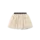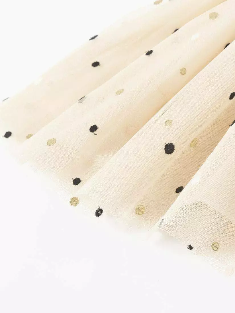 Спідниця світло-бежевого кольору. Пояс на резинці, чорного кольору з блискітками. Довжина спідниці до коліна. Є біла, непрозора підкладка. Верхній шар спідниці прикрашений дрібним горошком.