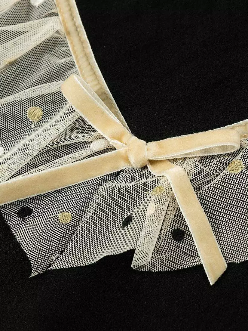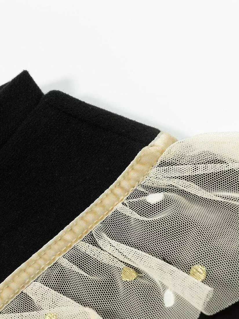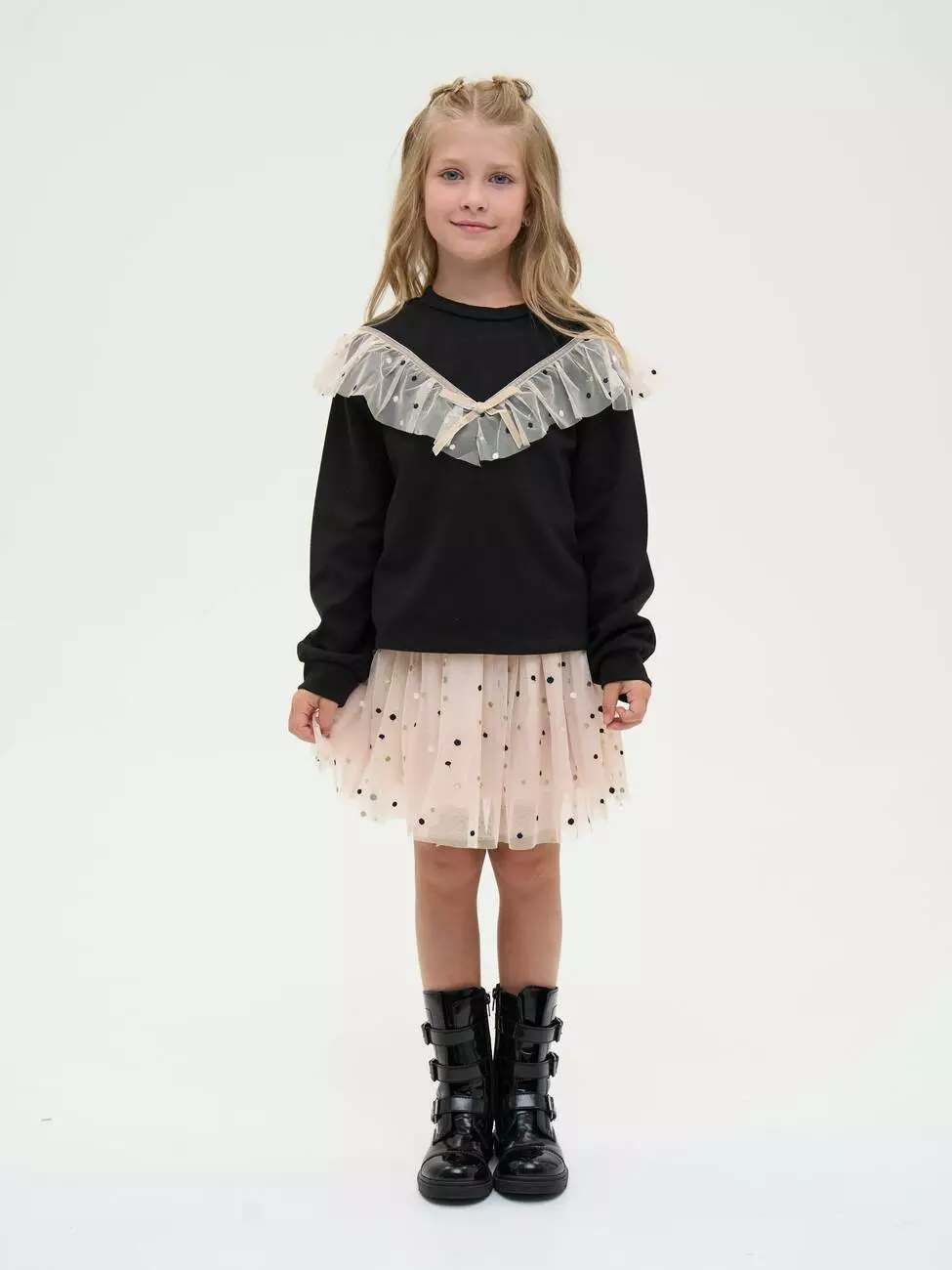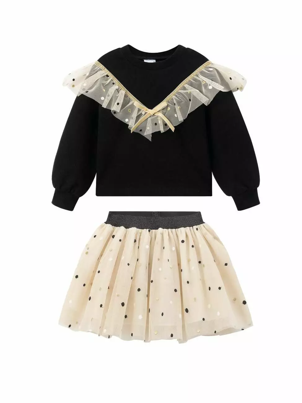 Світшот чорного кольору. Круглий виріз. Довгий рукав. По верхній частині світшота розташована оборка з фатину у V-образній формі і декоративний зав'язаний бантом із стрічки. Спідниця світло-бежевого кольору. Пояс на резинці, чорного кольору з блискітками. Довжина спідниці до коліна. Є біла, непрозора підкладка. Верхній шар спідниці прикрашений дрібним горошком. Розмірний ряд: на зріст від 98 см до 140 см Склад: 100% поліестер. Рекомендації з догляду: машинне прання при температурі 30 градусів.*Увага! Відтінок кольору на фото може трохи відрізнятися від реального.]]>