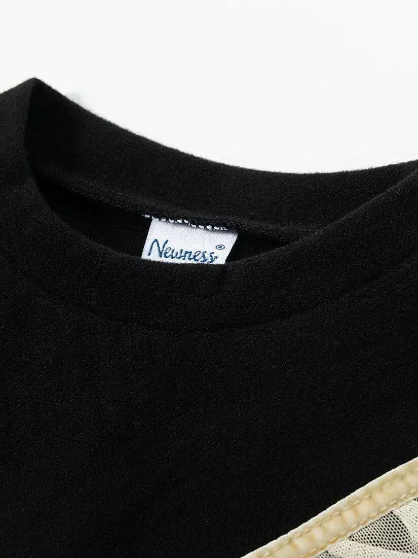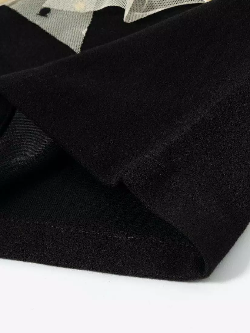 Світшот чорного кольору. Круглий виріз. Довгий рукав. По верхній частині світшота розташована оборка з фатину у V-образній формі і декоративний зав'язаний бантом із стрічки.