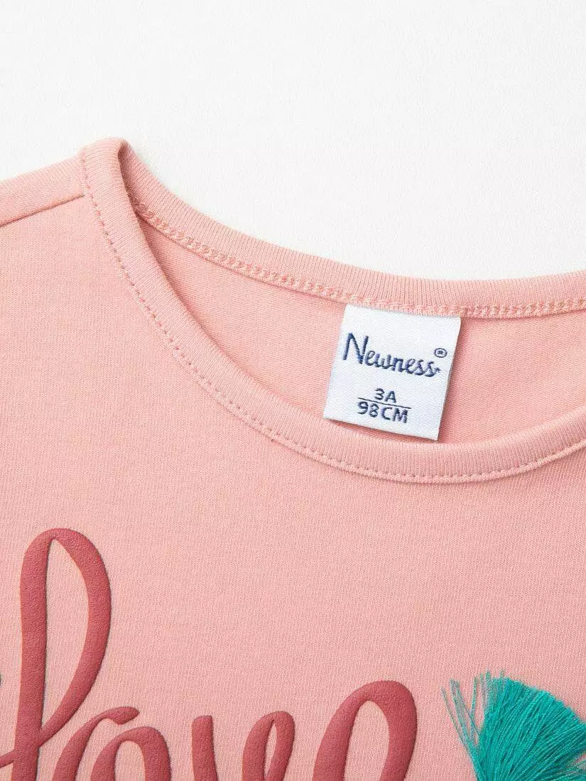 Лонгслів рожевого кольору. Круглий виріз горловини. Довгий рукав. Прямий крій. На грудях великий принт "Love" з декоративними кисточками.