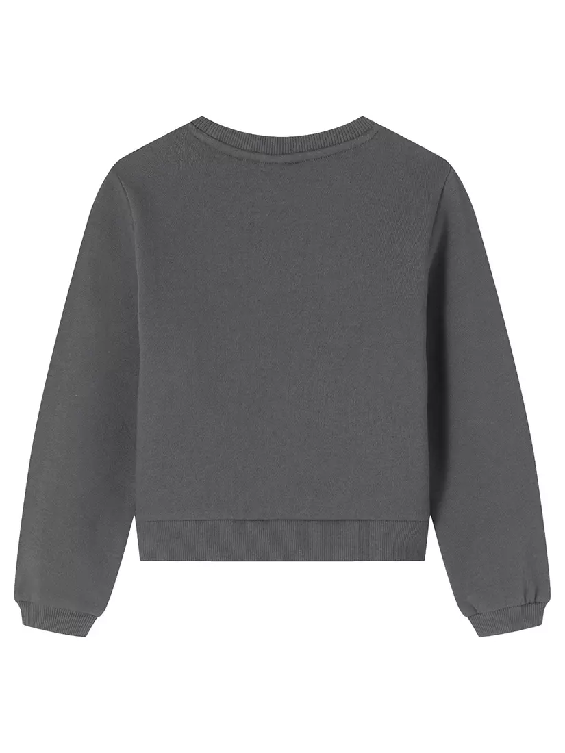 Світшот сірого кольору. Круглий виріз горловини. Довгий рукав. На грудях принт у вигляді напису. Горловина, манжети на рукавах та низ світшота обрамлені еластичною резинкою. Світшот з начосом.