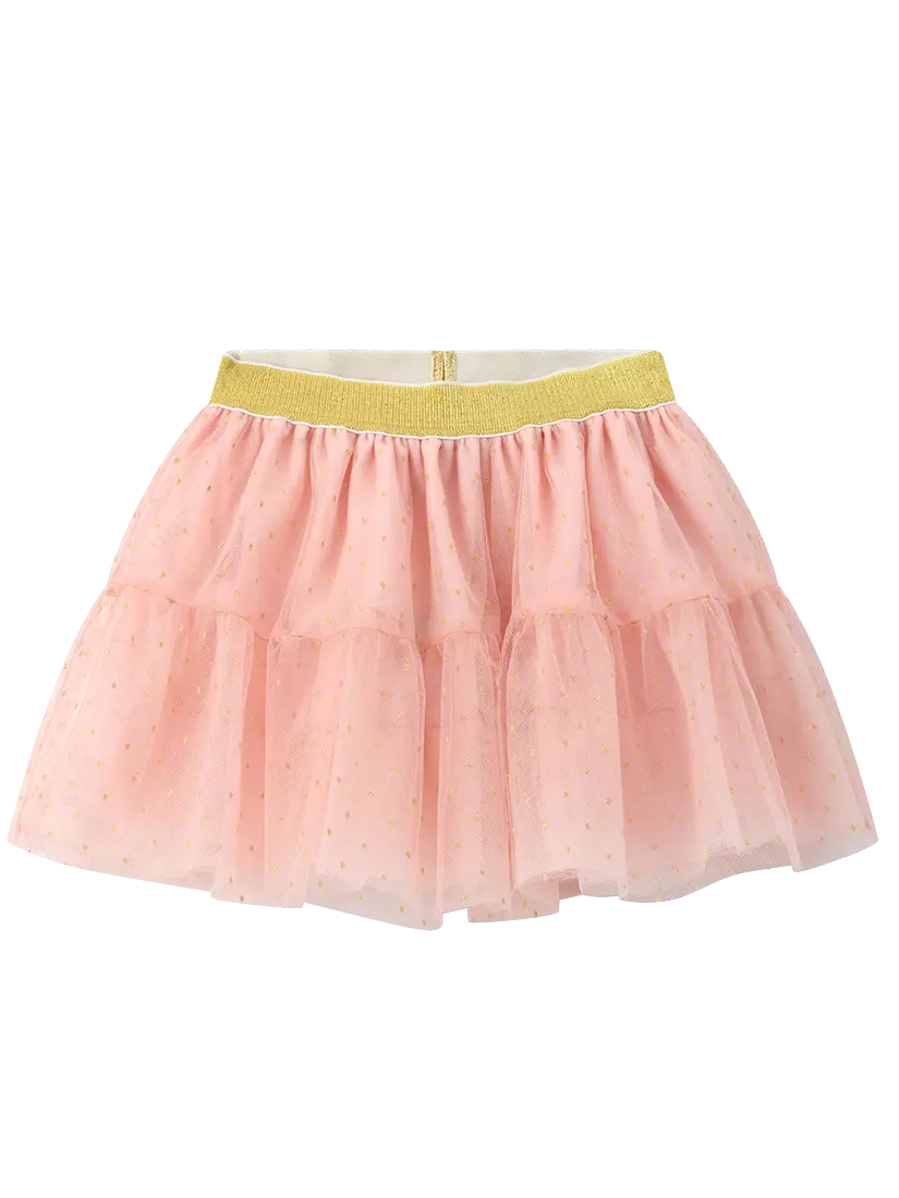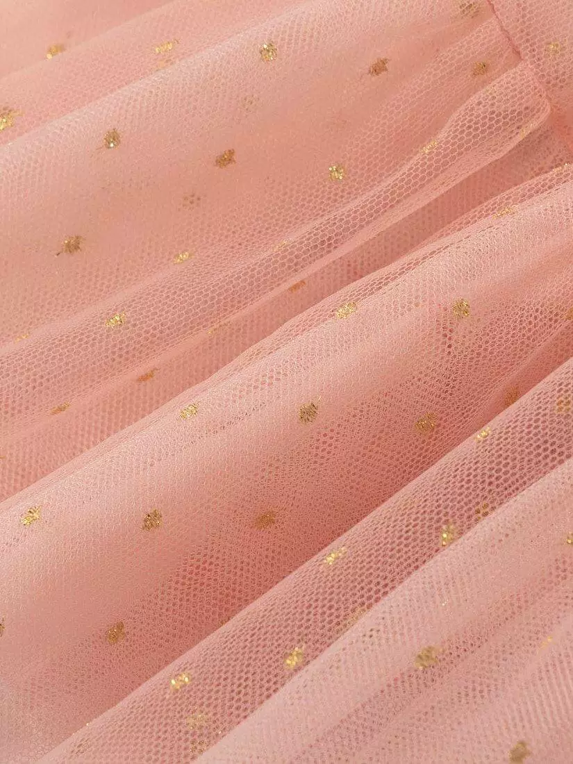 Спідниця рожевого кольору. Пояс на резинці. Кілька рівнів фатину + непрозорий під'юбник рожевого кольору. Декор - напилення золотого кольору у вигляді дрібної горошини.
