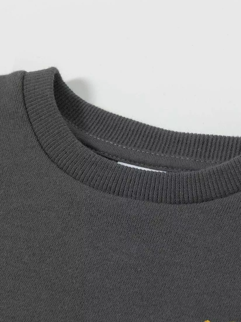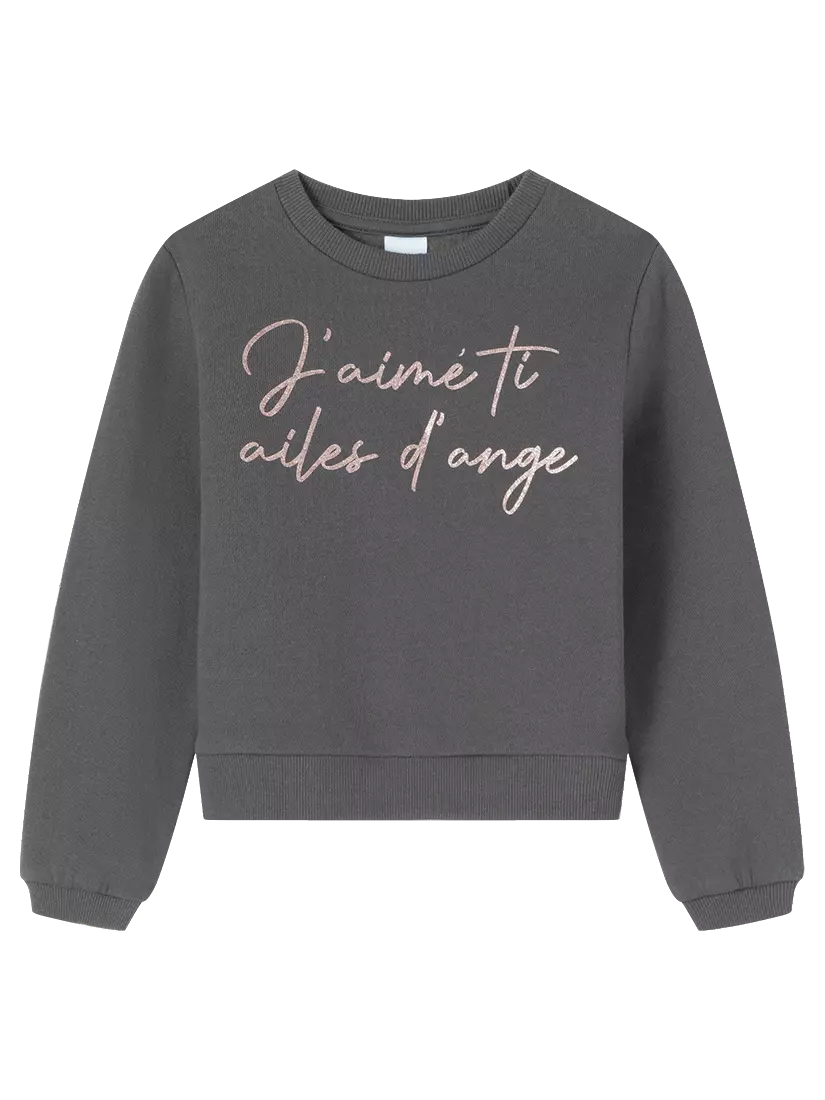 Світшот темно-сірого кольору. Круглий виріз горловини, довгий рукав. Занижена лінія плеча. Вільний крій. На грудях принт - серце і корона. На рукавах вставки з фатину чорного кольору з золотим напиленням. Горловина, манжети рукавів і низ світшота обрамлені м'якою і еластичною резинкою.