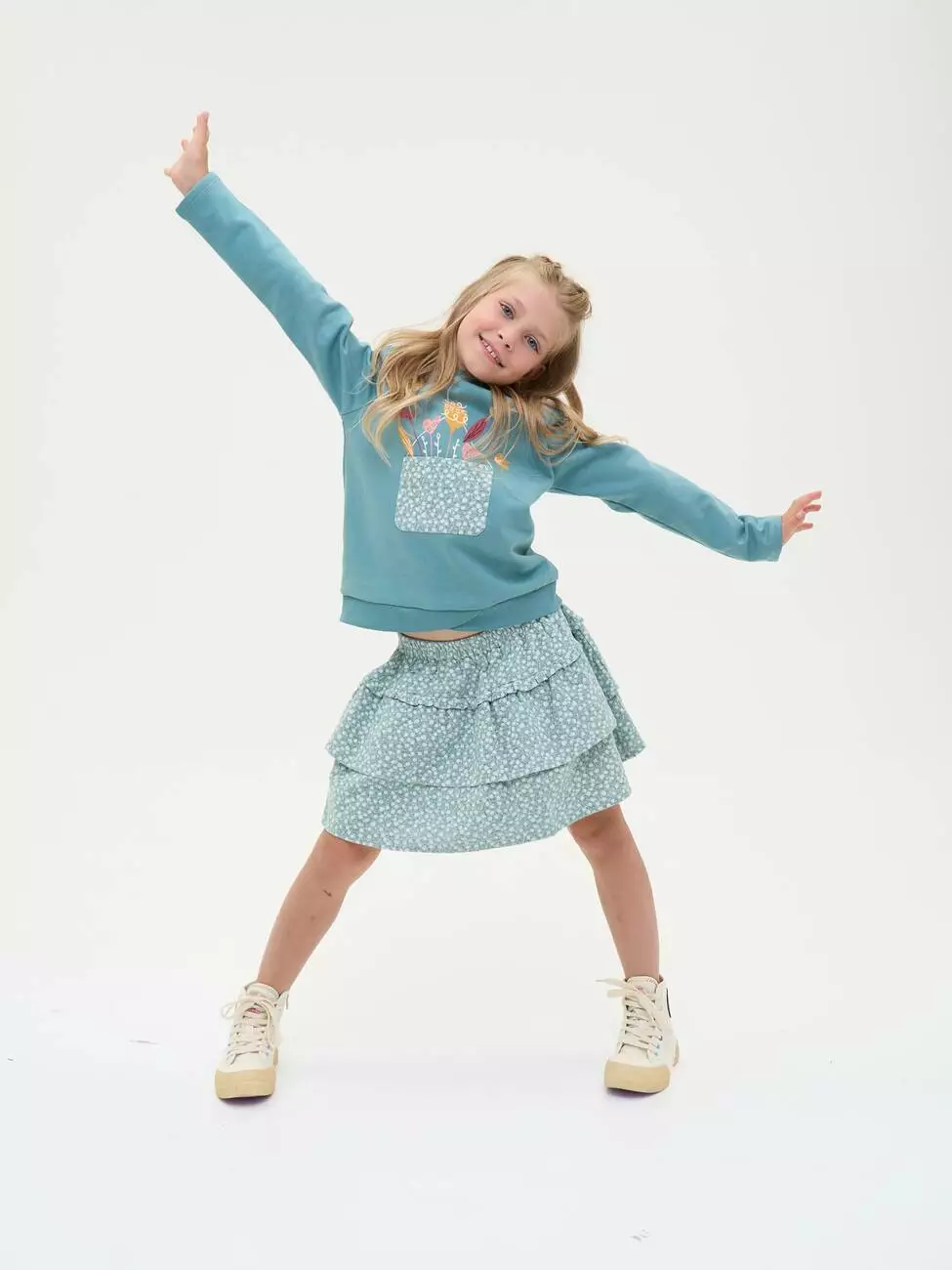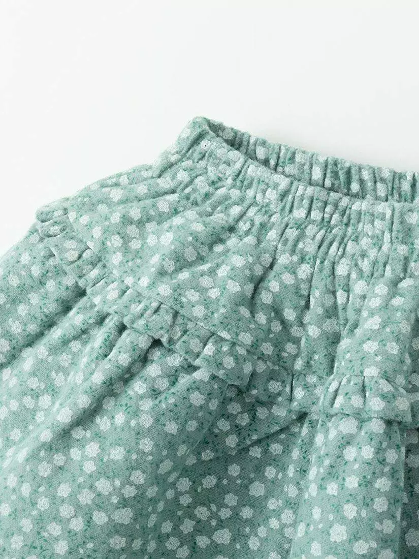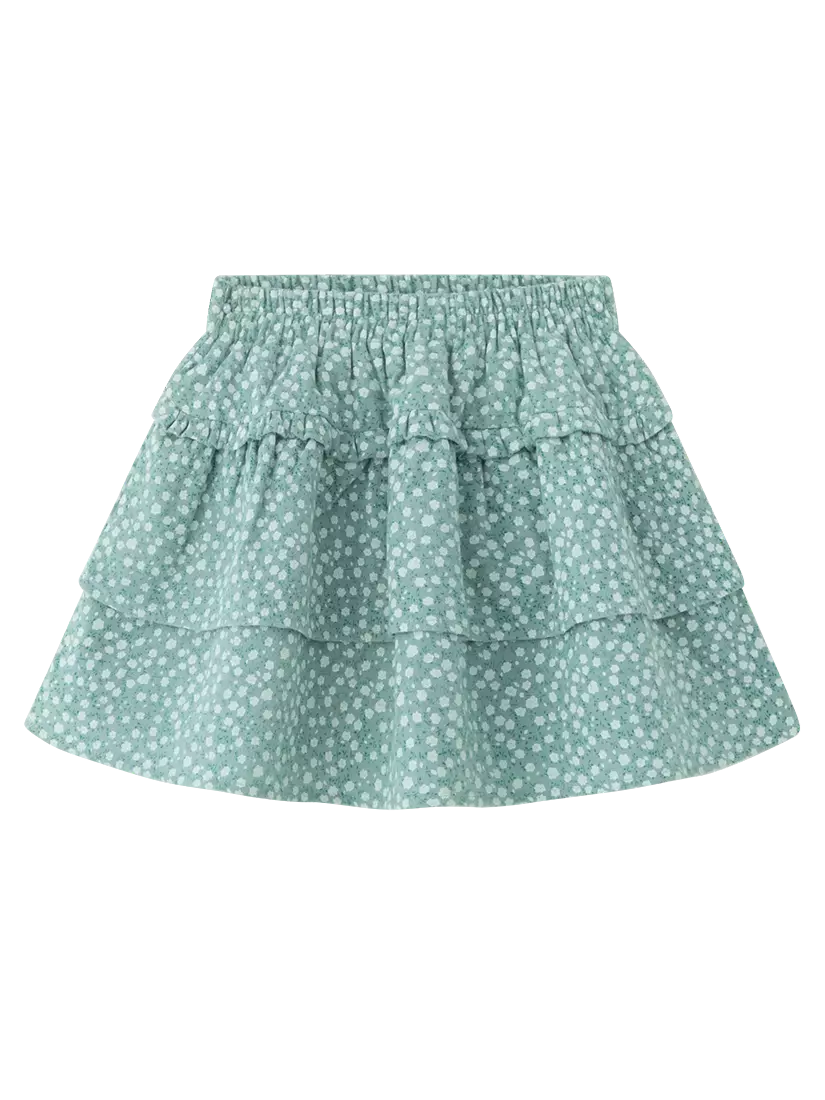 Спідниця світло-зеленого кольору. Пояс на резинці. Три рівні рюша. Довжина - вище коліна. Принт - маленька квіточка. Є білий під’юбник.
