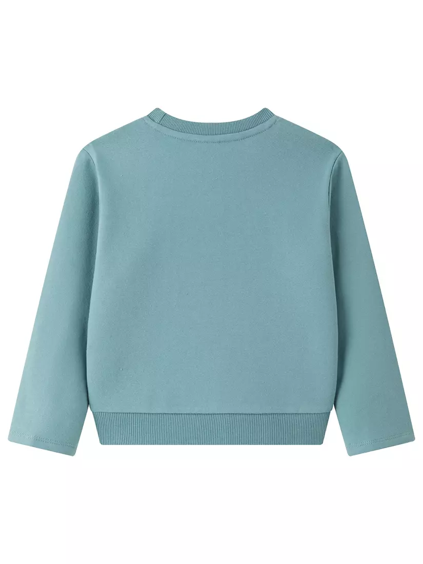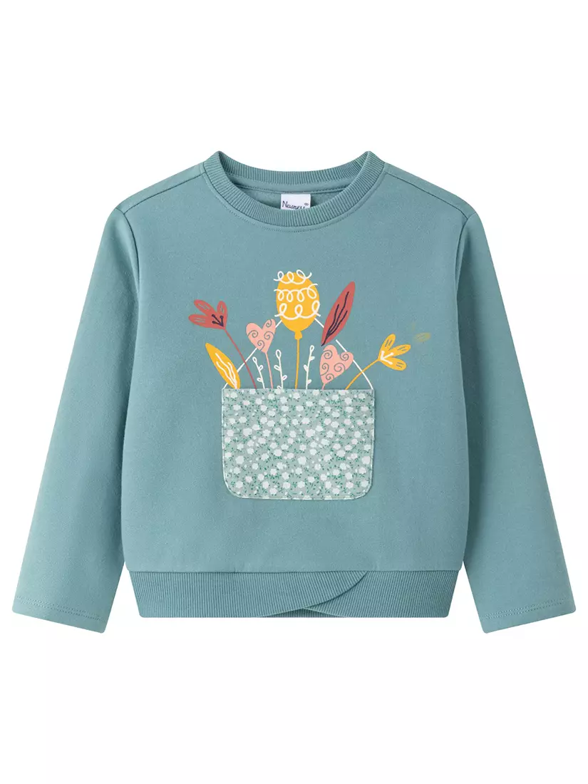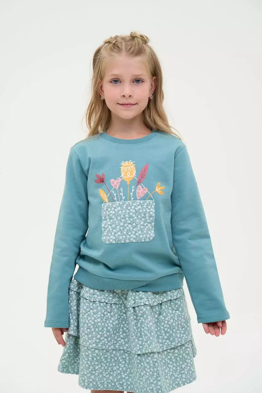 Світшот світло-зеленого кольору. Круглий виріз горловини. Довгий рукав. На грудях аплікація з квіткового принта та нашита кишеня. Горловина і низ світшота обрамлені еластичною резинкою. Світшот з начосом.
