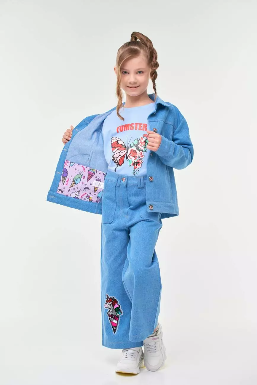 Низ: джинси світло-блакитного кольору. Середня посадка. Штанини злегка розширені до низу, з фігурними накладними кишенями по переду та аплікацією з двосторонніх паєток у вигляді Єдинорога. Середня посадка. Застібка на блискавці. В пояс по спинці вставлена резинка, на пояс нашиті шльовки. Ззаду штанів кокетка, відстрочена по шву обробною ниткою. Також, обробною ниткою відстрочені всі шви джинсів.