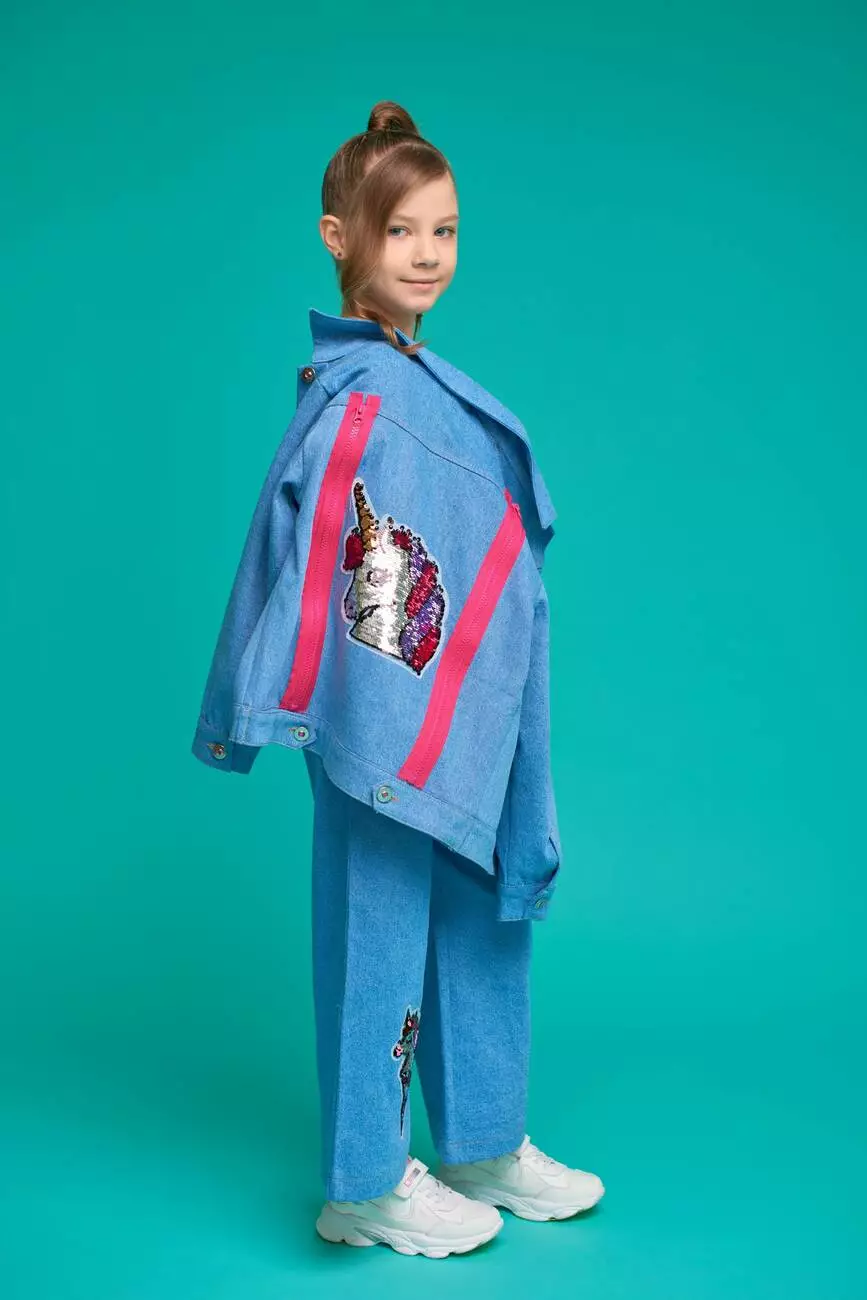 Верх: Куртка світло-блакитного кольору. Класичний крій. Застібка - на ґудзиках. Спереду і на спинці кокетки відстрочені обробною ниткою. Спереду куртки є рельєфи, в яких розташовані кишені. На спинці куртки - аплікація Єдиноріг з двосторонніх паєток, а також декоративні блискавки малинового кольору в тон аплікації. По низу виробу манжет, ззаду якого пристрочені патики, що застібаються на ґудзики. На рукавах манжети з ґудзиками. Всі шви куртки відстрочені декоративною ниткою.