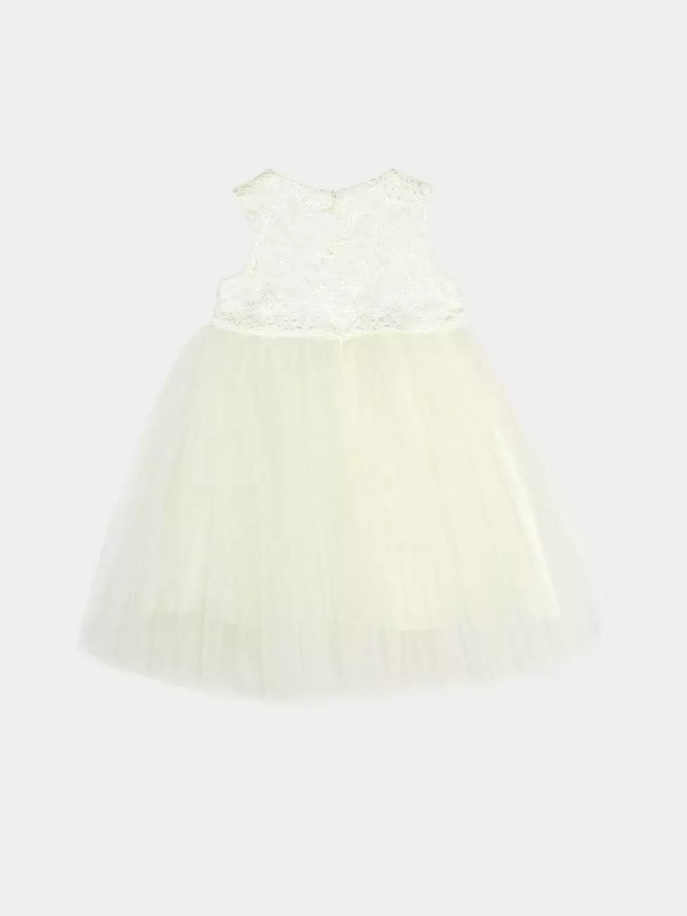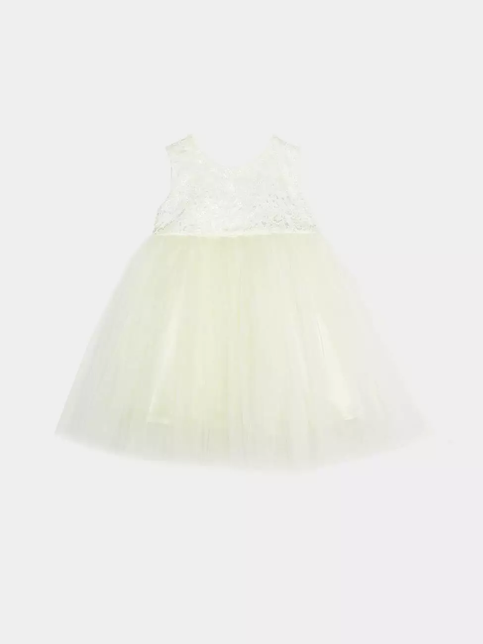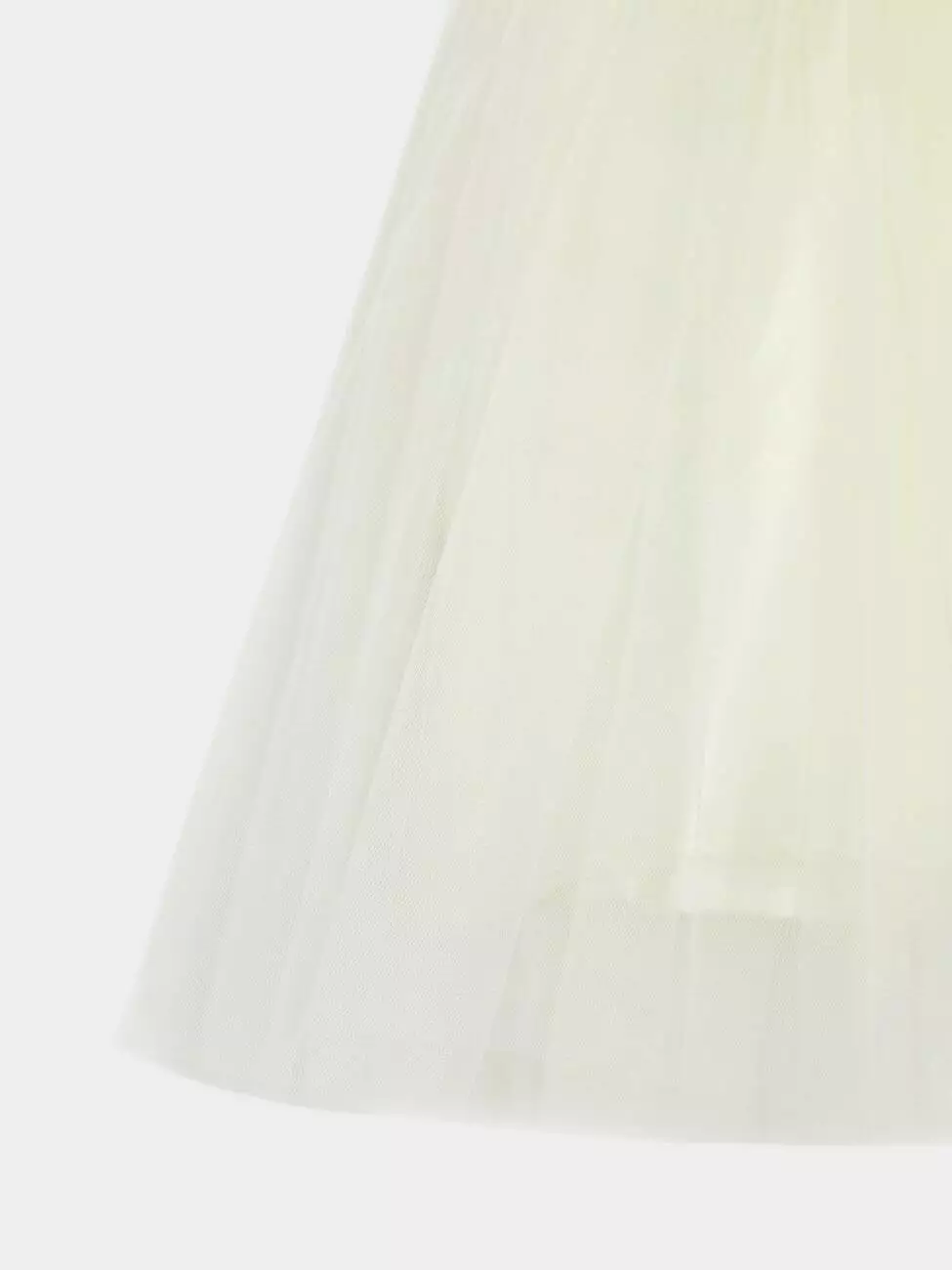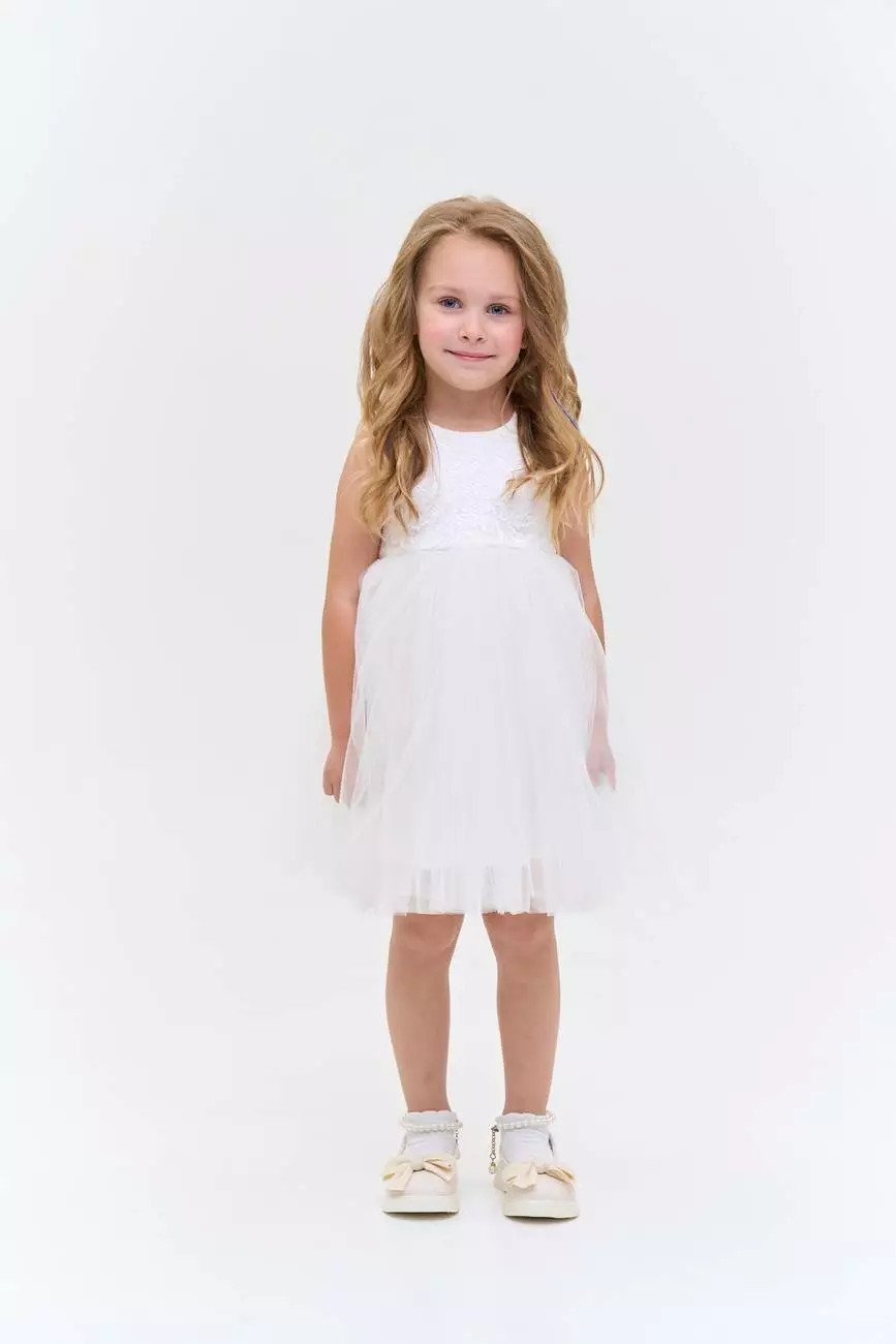 Сукня без рукавів. Круглий виріз горловини. Застібка – на спинці блискавка. Спідниця пишна виконана із трьох шарів фатину. Четвертий, нижній шар спідниці із атласу. Добре тримає форму. Модель дуже зручна – абсолютно не сковує рухи.