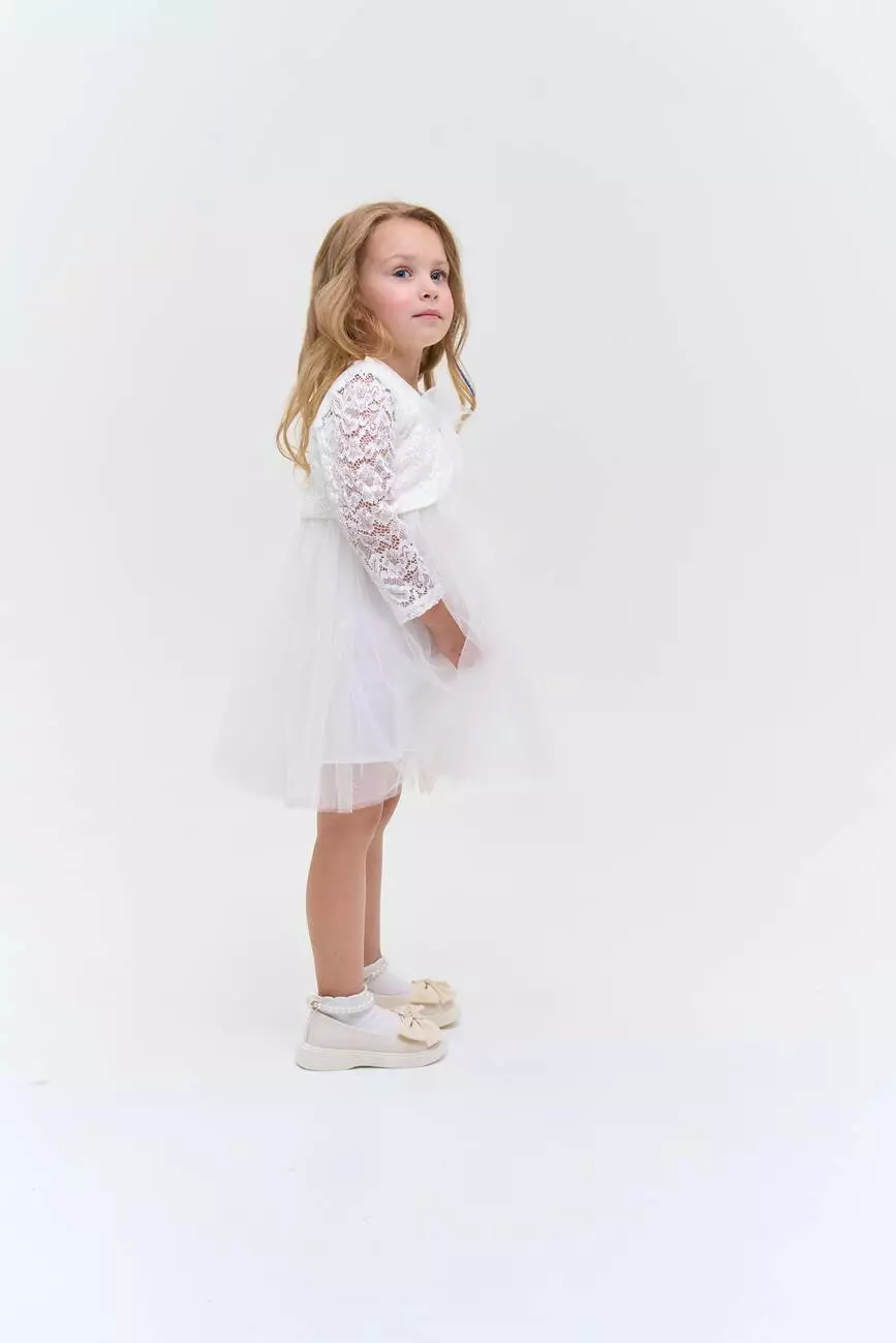 Сукня без рукавів. Круглий виріз горловини. Застібка – на спинці блискавка. Спідниця пишна виконана із трьох шарів фатину. Четвертий, нижній шар спідниці із атласу. Добре тримає форму. Модель дуже зручна – абсолютно не сковує рухи.Болеро з довгими рукавами. Без коміра. Попереду зав'язується на бант. Склад тканини: сукня: 50% віскоза, 50% поліестер; болеро: 50% бавовна, 50% поліестер