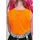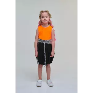 - Топ помаранчевий. Укорочена довжина. Кругла горловина. Без рукавів. Внизу срібна широка вставка із чорним принтом. Застібка - ззаду ґудзик.