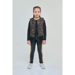 Деталі моделі: комплект складається з базового чорного лонгсліву, легінсів з еко шкіри та ошатного жилета, прикрашеного паєтками.