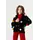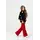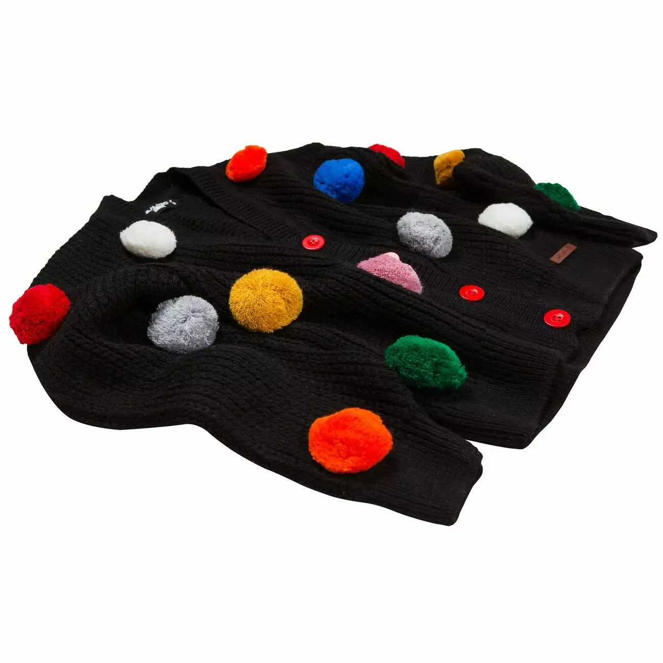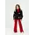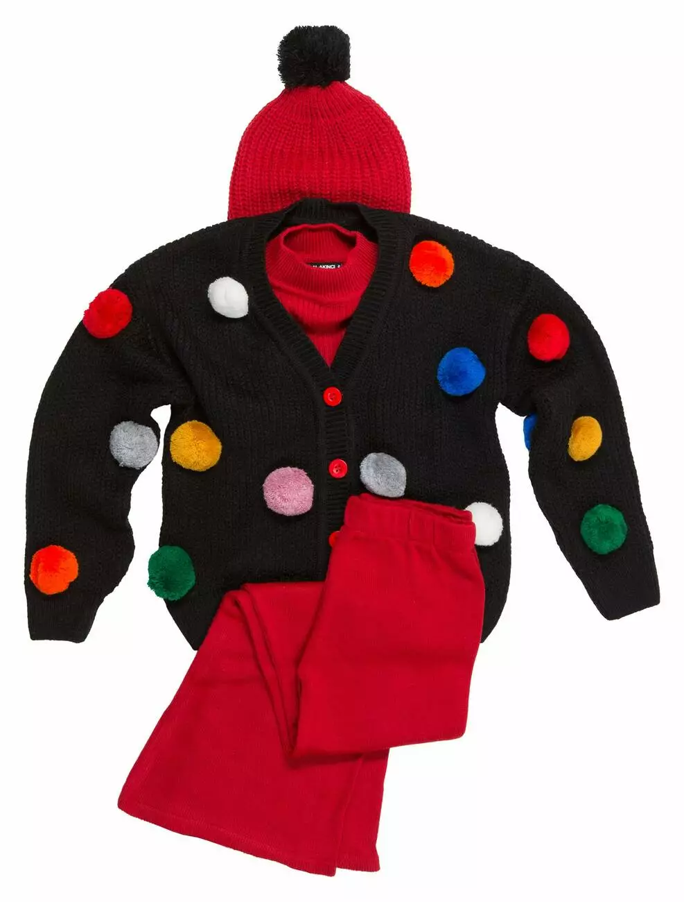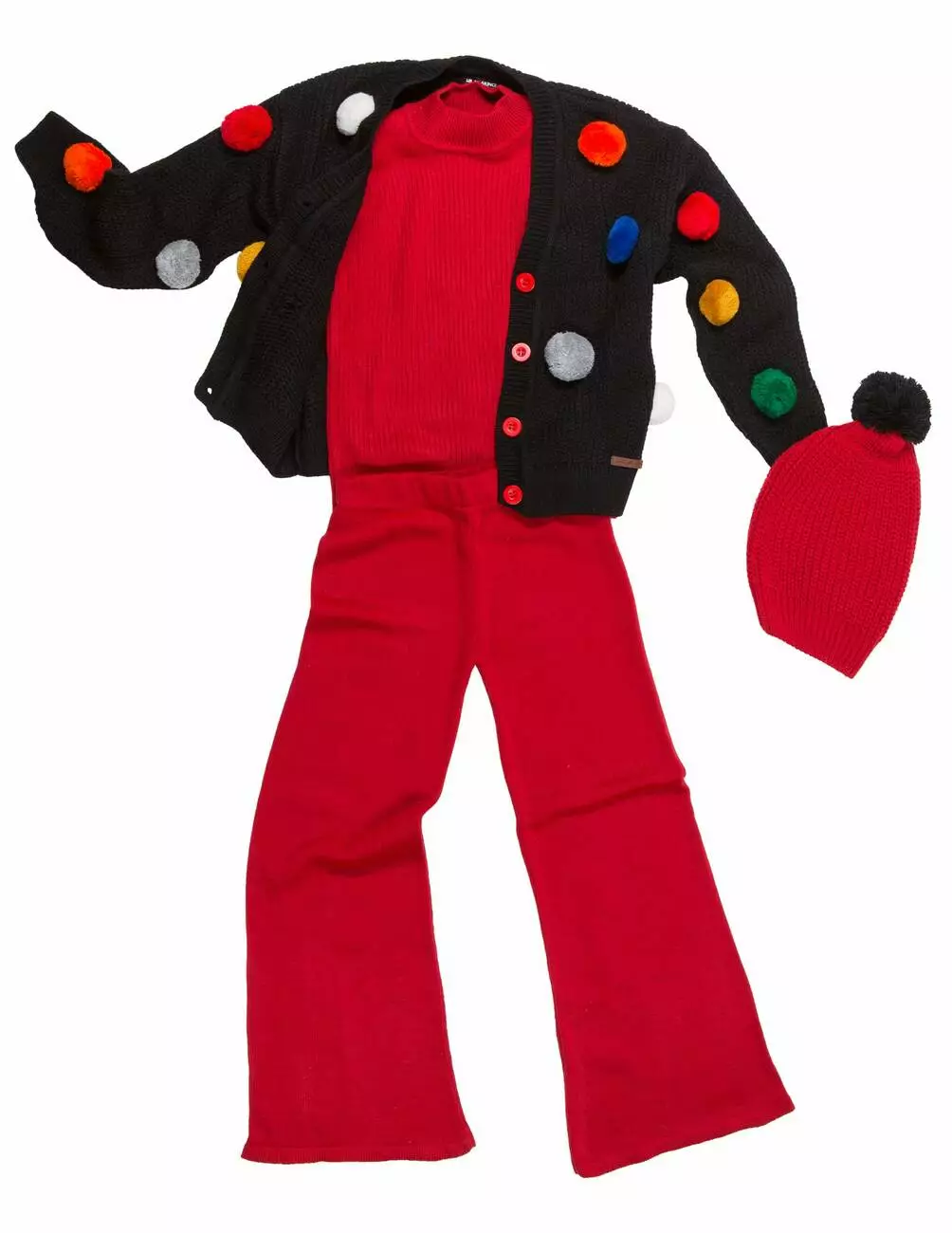 Деталі моделі: костюм-трійка (гольф без рукавів, штани та кардиган). Колір червоний з чорним. Кардиган із V-подібним вирізом. Застібка – гудзики. Декор - великі кольорові помпони. Гольф однотонний, синього кольору із коміром-стійкою. Штани прямого крою, трохи розширені до низу. Пояс на резинці. Середня висота по талії. Кишень немає. Матеріал - трикотаж. Сезон – осінь-зима-весна.