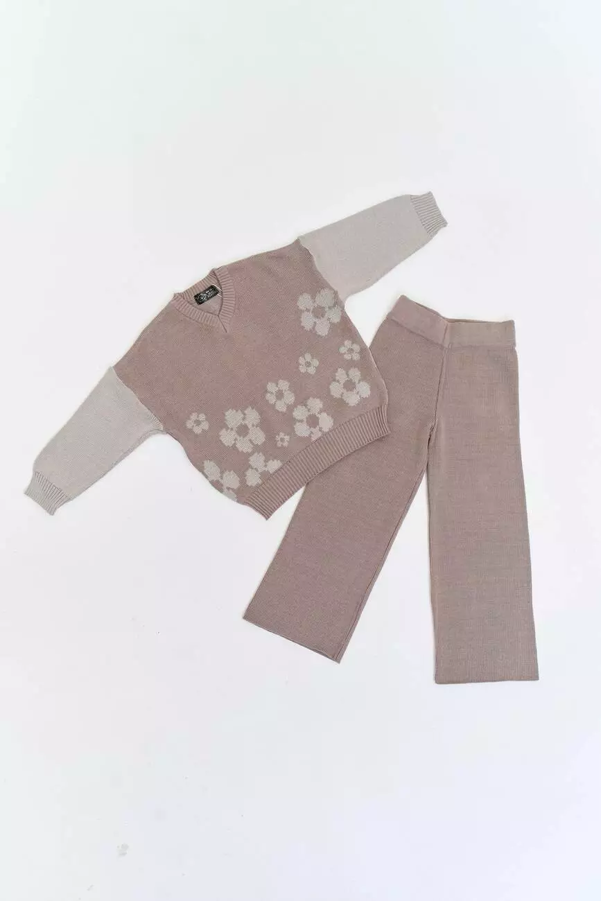 Джемпер: Фасон оверсайз. Занижена лінія плеча. V-подібний виріз горловини. Манжети та низ джемпера оформлені еластичною резинкою. Візерунок - квіти.Брюки: Модель палаццо. Середня висота по лінії талії. Пояс на широкій резинці. Без кишень. Візерунок - однотонний. Розмірний ряд: на зріст від 110 см до 128 см