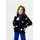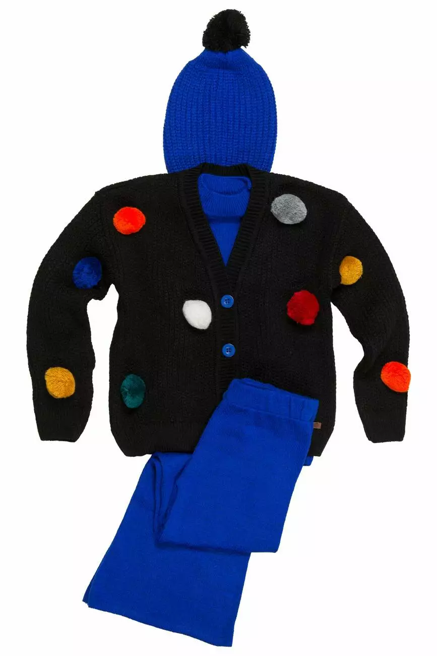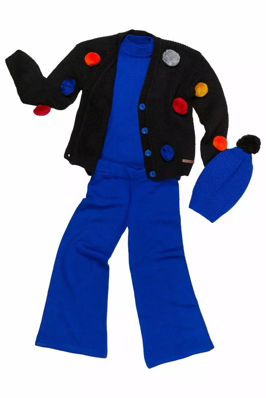Деталі моделі: костюм-трійка (гольф без рукавів, штани та кардиган). Колір синій з чорним. Кардиган із V-подібним вирізом. Застібка – гудзики. Декор - великі кольорові помпони. Гольф однотонний, синього кольору із коміром-стійкою. Штани прямого крою, трохи розширені до низу. Пояс на резинці. Середня висота по талії. Кишень немає. Матеріал - трикотаж. Сезон – осінь-зима-весна.