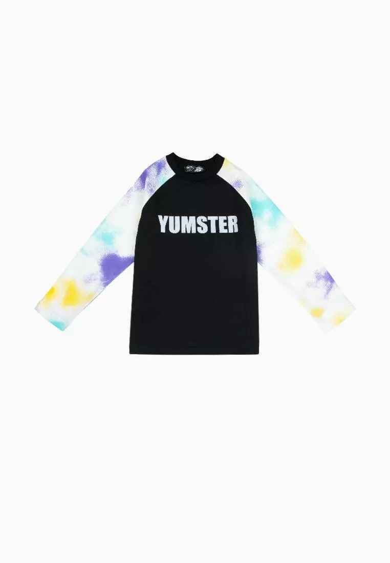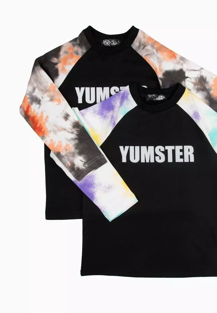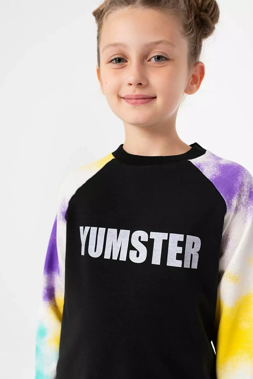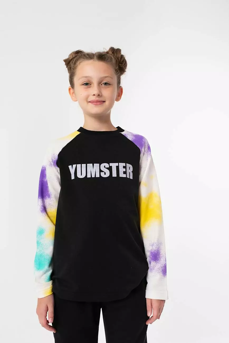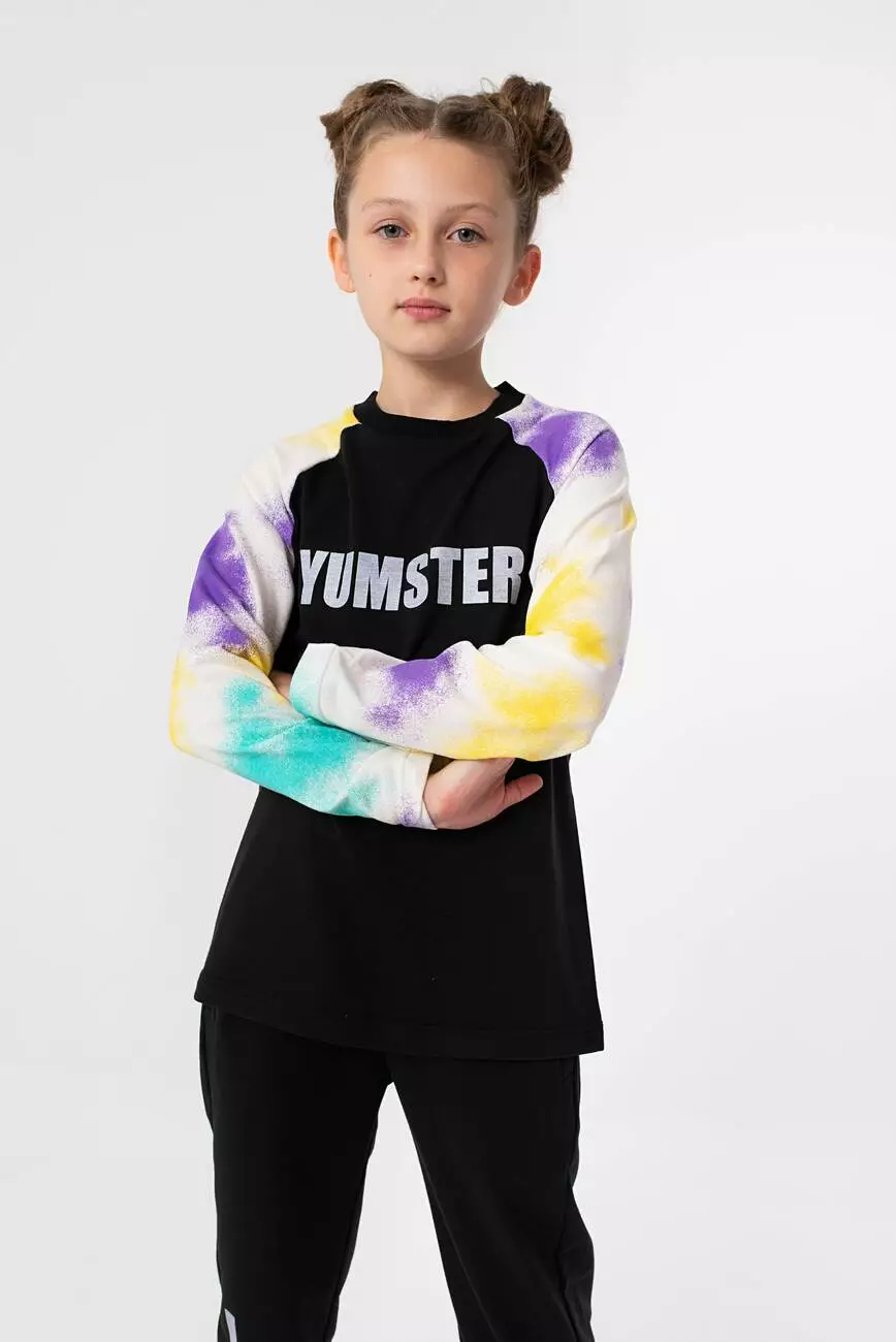 Деталі моделі: лонгслів (джемпер) прямого силуету, з довгими рукавами. Основний колір лонгсліву - чорний. Рукава з принтом тай-дай. Фасон рукава - реглан. Спереду фірмовий принт YUMSTER. Тканина - двунитка. Кругла горловина, оброблена обтачкою.