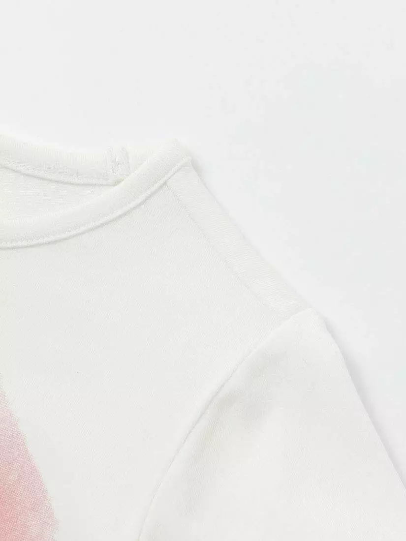 Деталі моделі: лонгслів білого кольору. Кругла горловина. Довгий рукав. Попереду крутий великий принт.
