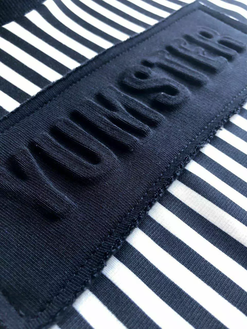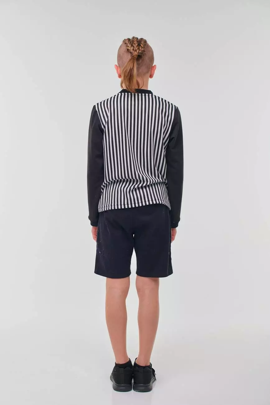 Деталі моделі: лонгслів в чорно-білу смужку. Кругла горловина. Рукава - однотонні, чорного кольору. Манжети на рукавах виконані з якісної рибани. На грудях аплікація з 3D тисненням.Склад: 70% бавовна, 30% поліестер.