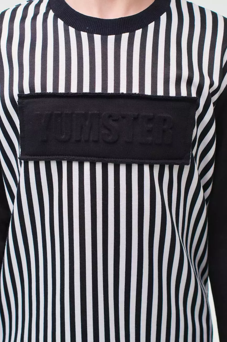 Деталі моделі: лонгслів в чорно-білу смужку.
