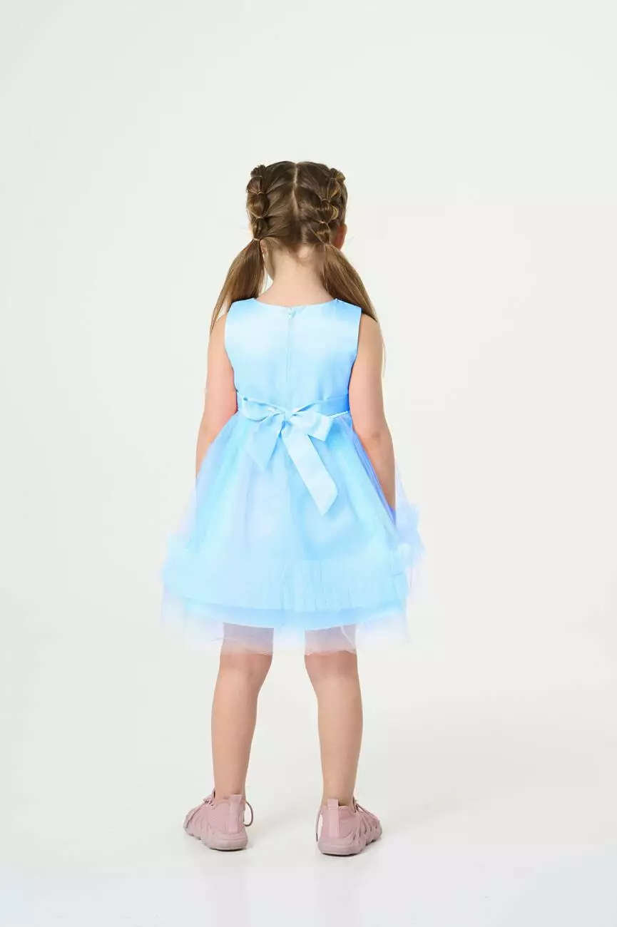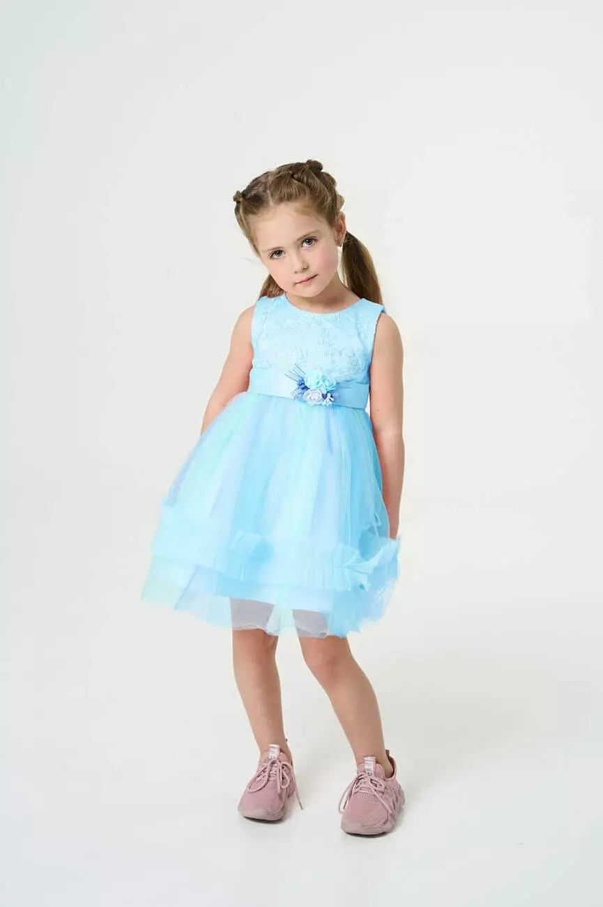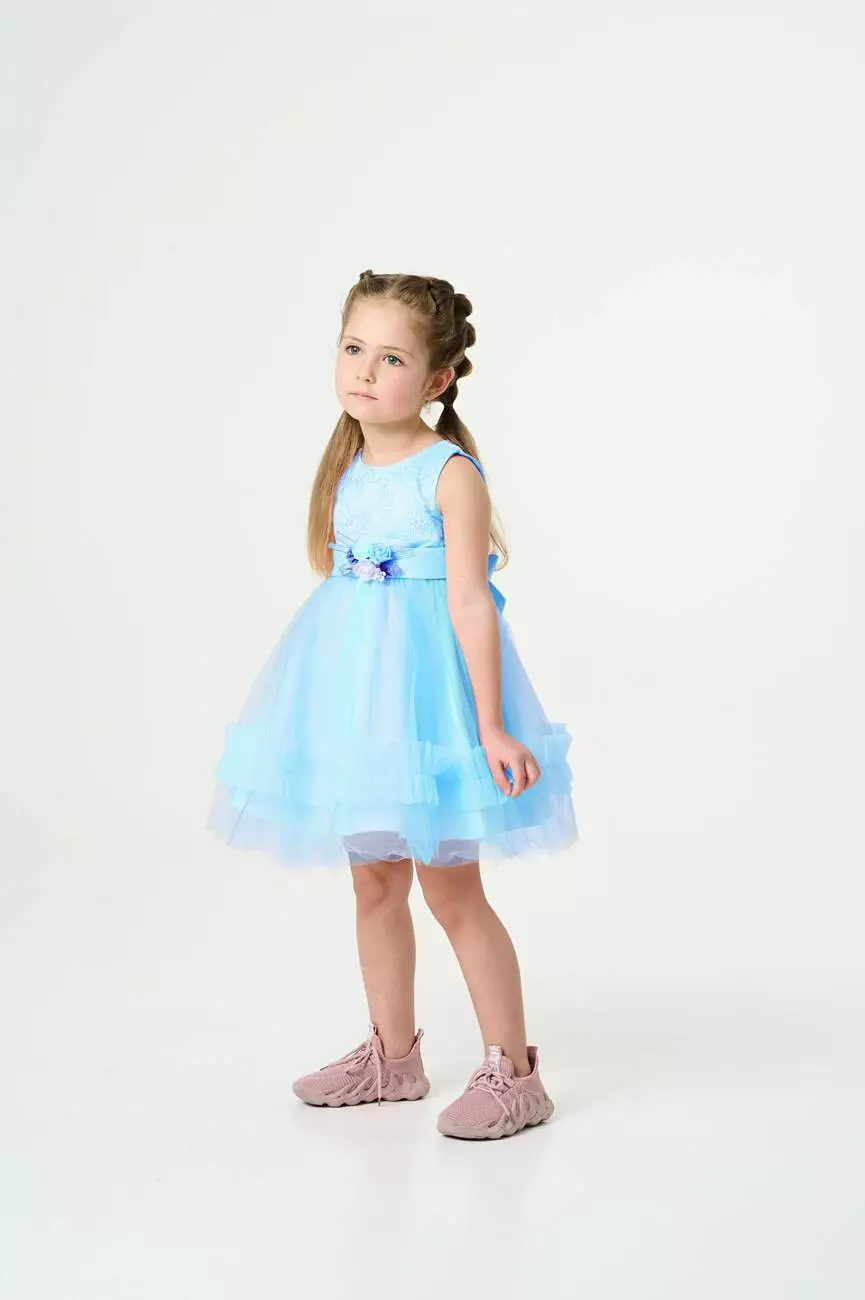 Деталі моделі: основний колір сукні – блакитний. Кругла горловина, відкриті плечі. Застібка – на спинці блискавка. Приталений топ сукні оздоблений квітковою вишивкою. Атласний пояс сукні прикрашений милим букетиком троянд, а ззаду зав'язується лаконічним бантом. Верхній шар спідниці виконаний із фатину в градієнтному забарвленні ніжних тонів. Нижній шар спідниці із непрозорої тканини. Довжина сукні – до колін.