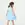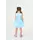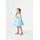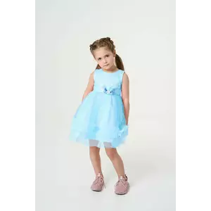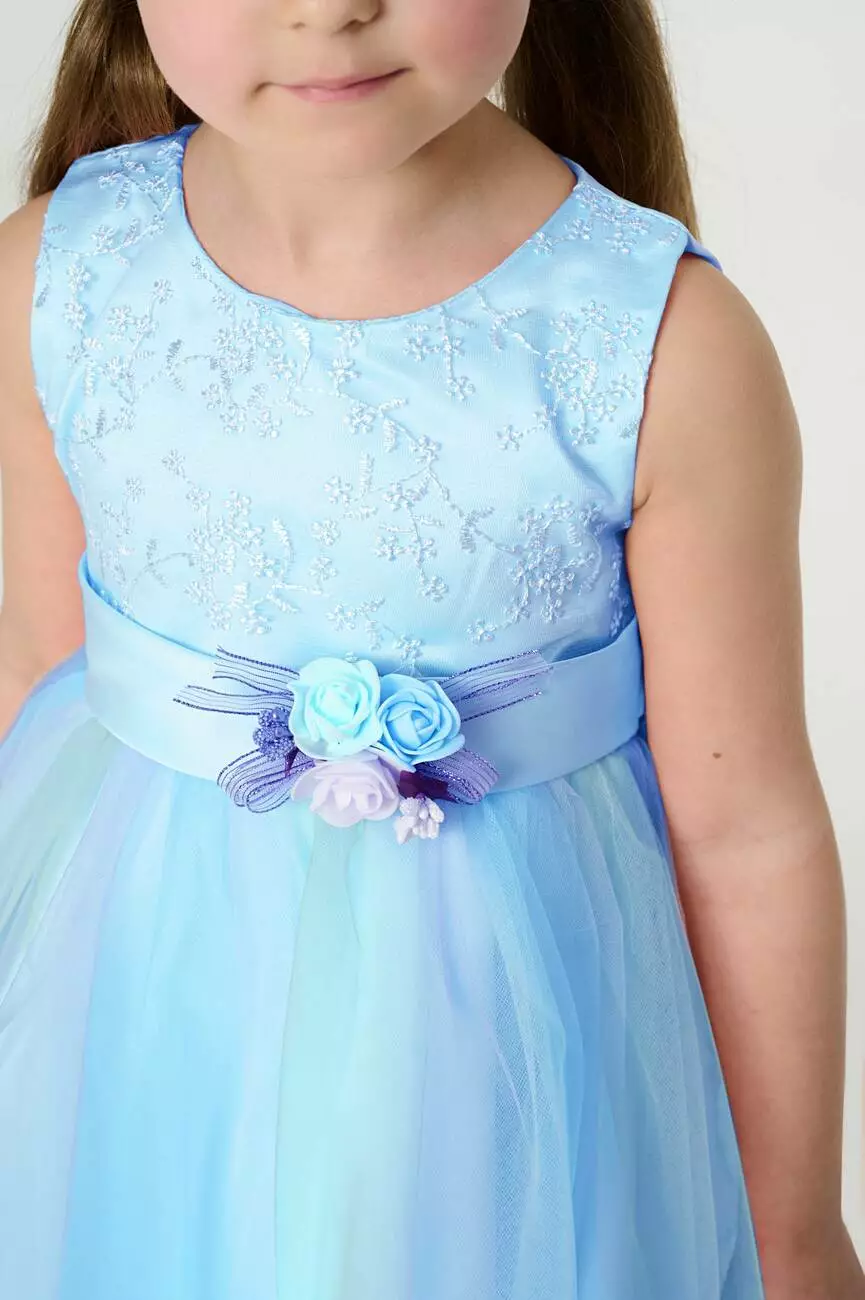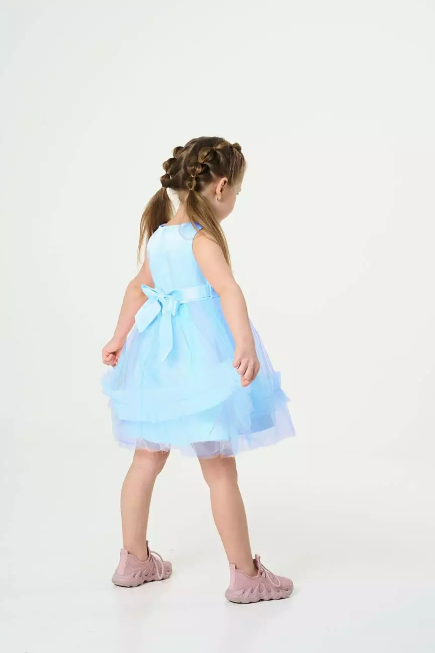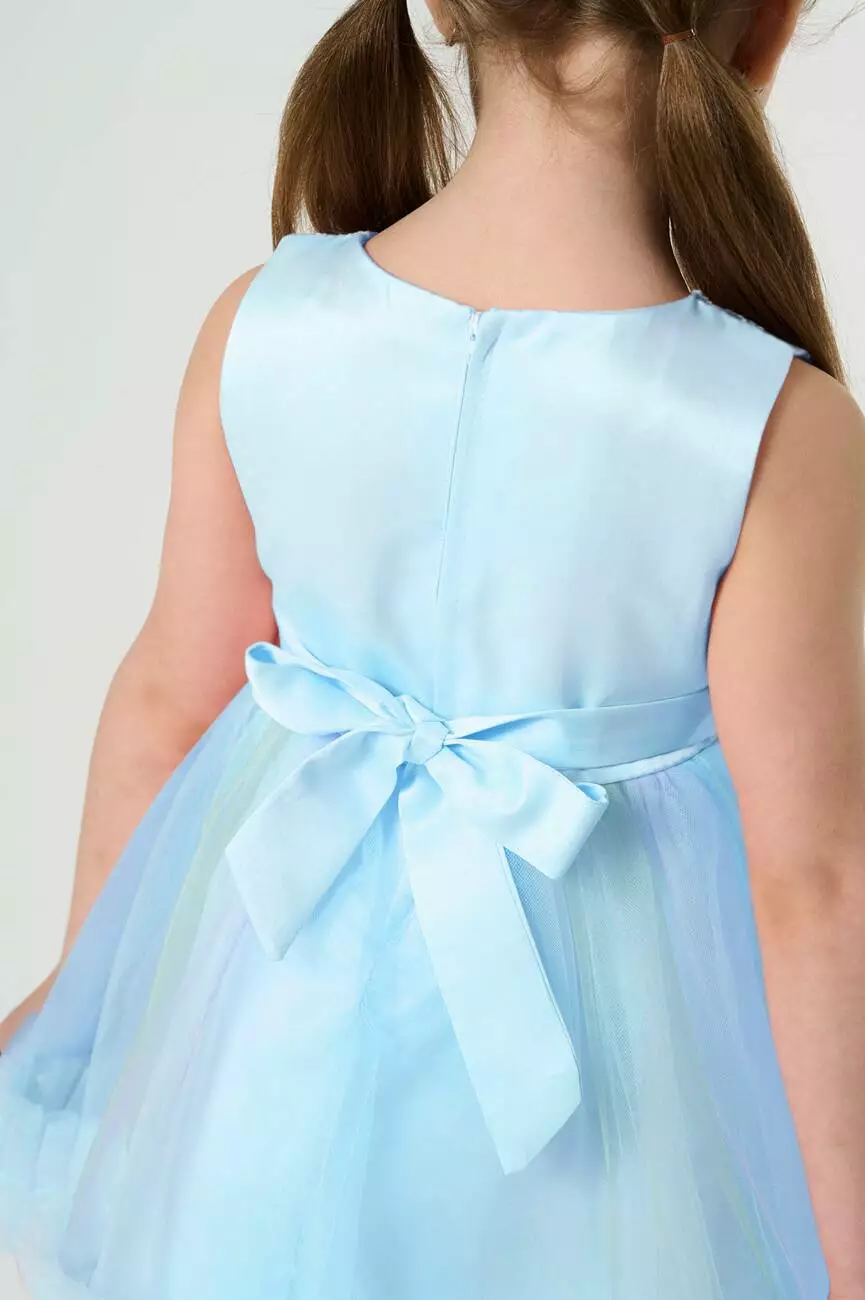 Деталі моделі: основний колір сукні – блакитний. Кругла горловина, відкриті плечі. Застібка – на спинці блискавка. Приталений топ сукні оздоблений квітковою вишивкою. Атласний пояс сукні прикрашений милим букетиком троянд, а ззаду зав'язується лаконічним бантом. Верхній шар спідниці виконаний із фатину в градієнтному забарвленні ніжних тонів. Нижній шар спідниці із непрозорої тканини. Довжина сукні – до колін.