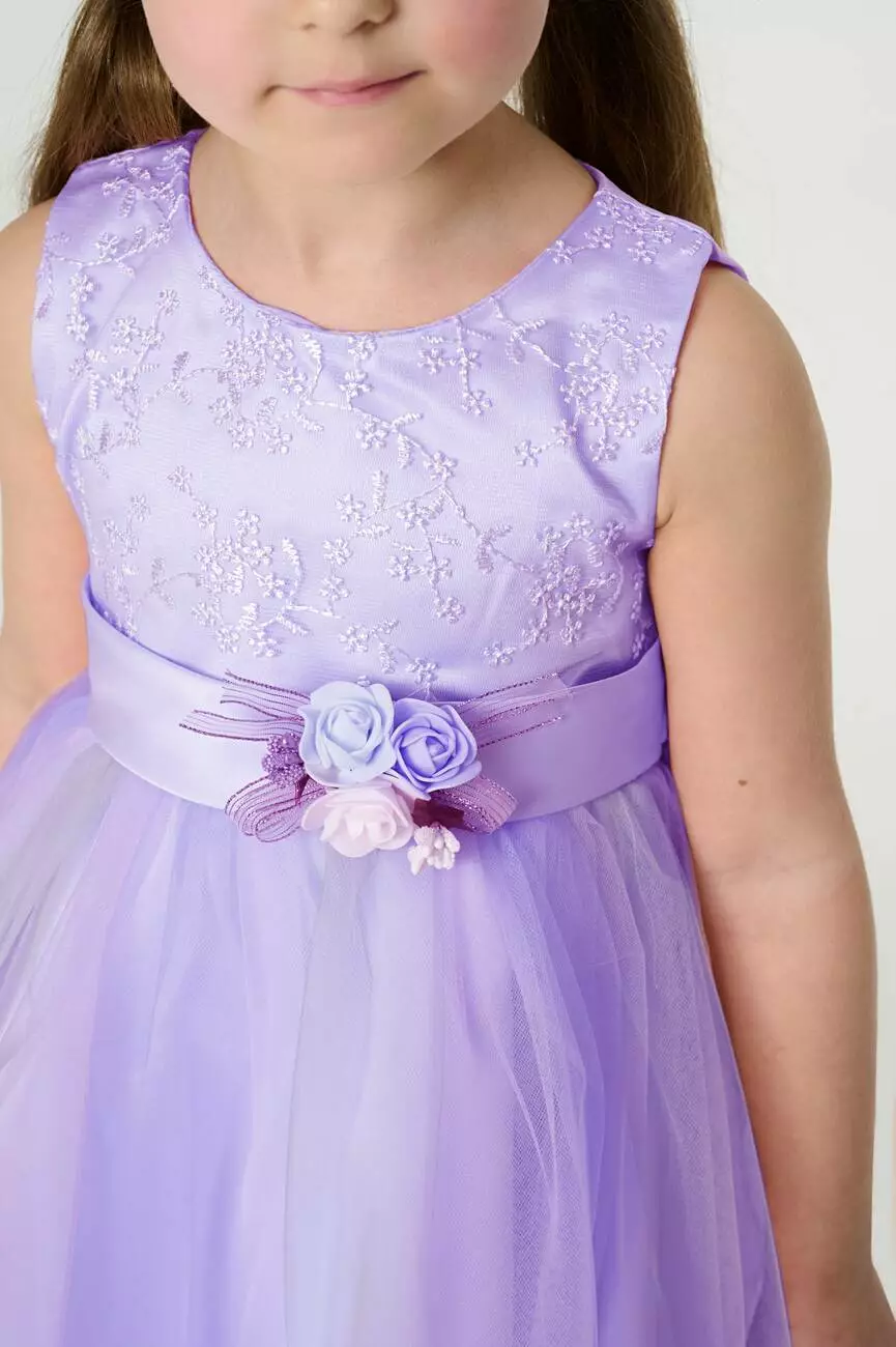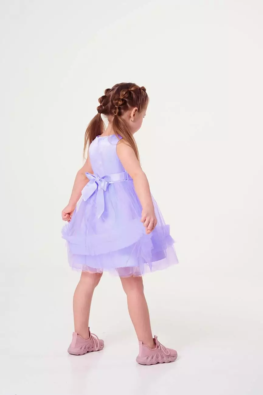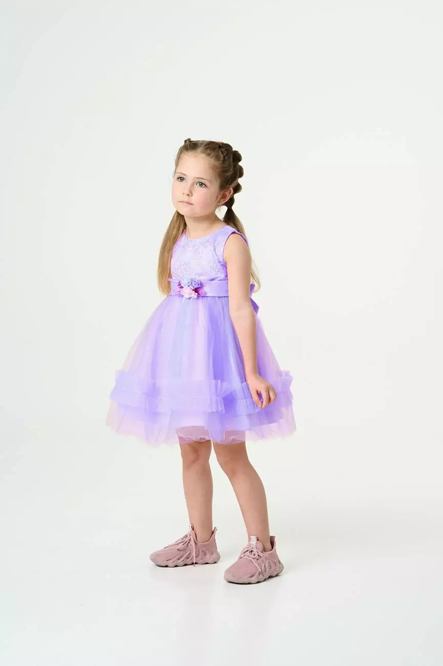 Деталі моделі: основний колір сукні – бузковий. Кругла горловина, відкриті плечі. Застібка – на спинці блискавка. Приталений топ сукні оздоблений квітковою вишивкою. Атласний пояс сукні прикрашений милим букетиком троянд, а ззаду зав'язується лаконічним бантом. Верхній шар спідниці виконаний із фатину в градієнтному забарвленні ніжних тонів. Нижній шар спідниці із непрозорої тканини. Довжина сукні – до колін.