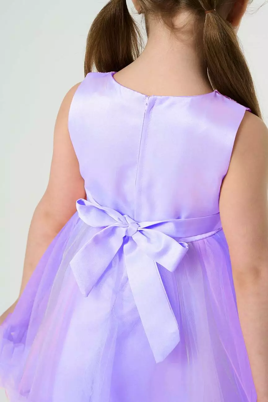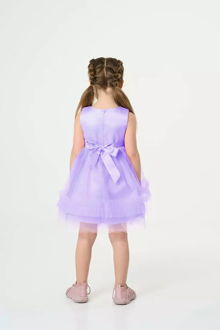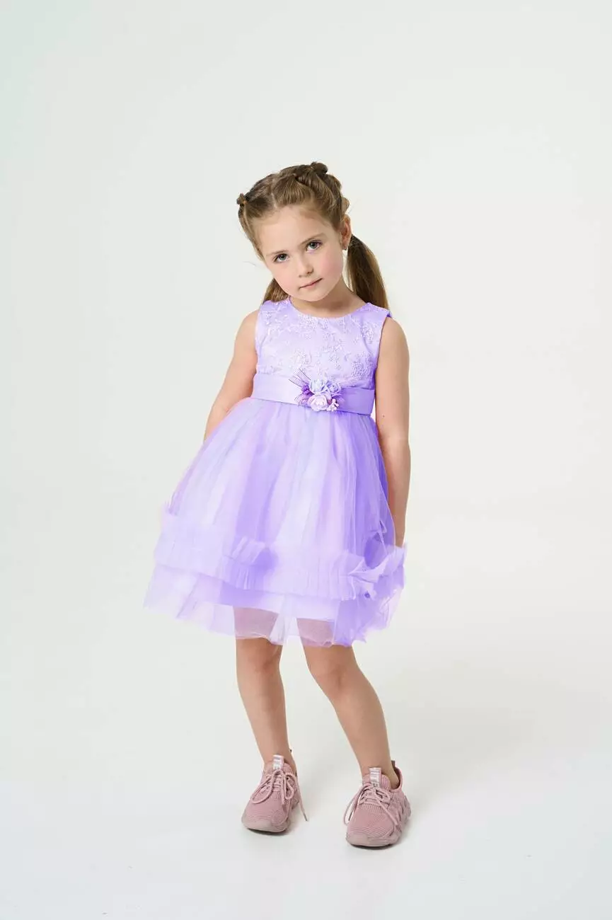 Деталі моделі: основний колір сукні – бузковий. Кругла горловина, відкриті плечі. Застібка – на спинці блискавка. Приталений топ сукні оздоблений квітковою вишивкою. Атласний пояс сукні прикрашений милим букетиком троянд, а ззаду зав'язується лаконічним бантом. Верхній шар спідниці виконаний із фатину в градієнтному забарвленні ніжних тонів. Нижній шар спідниці із непрозорої тканини. Довжина сукні – до колін.
