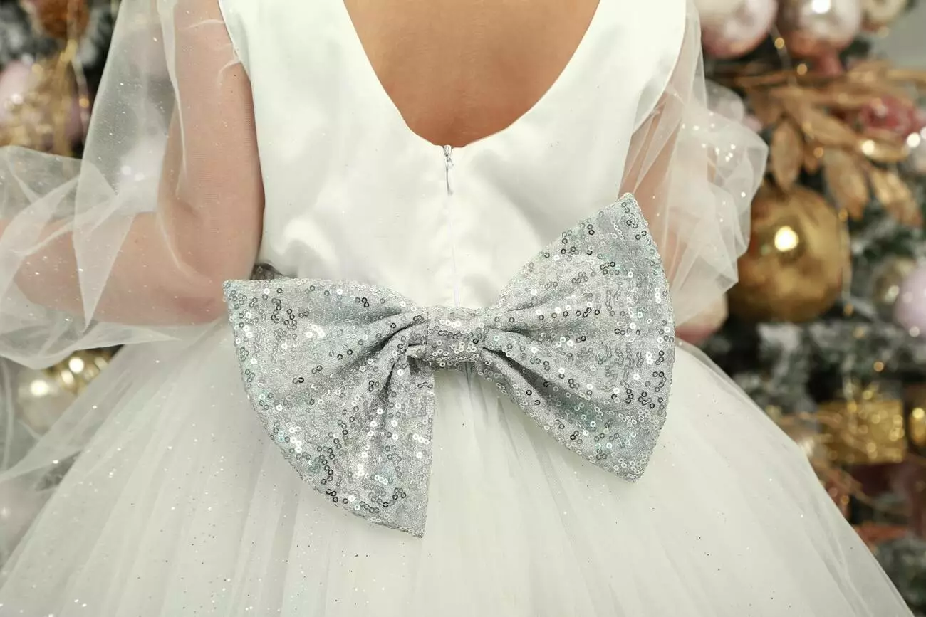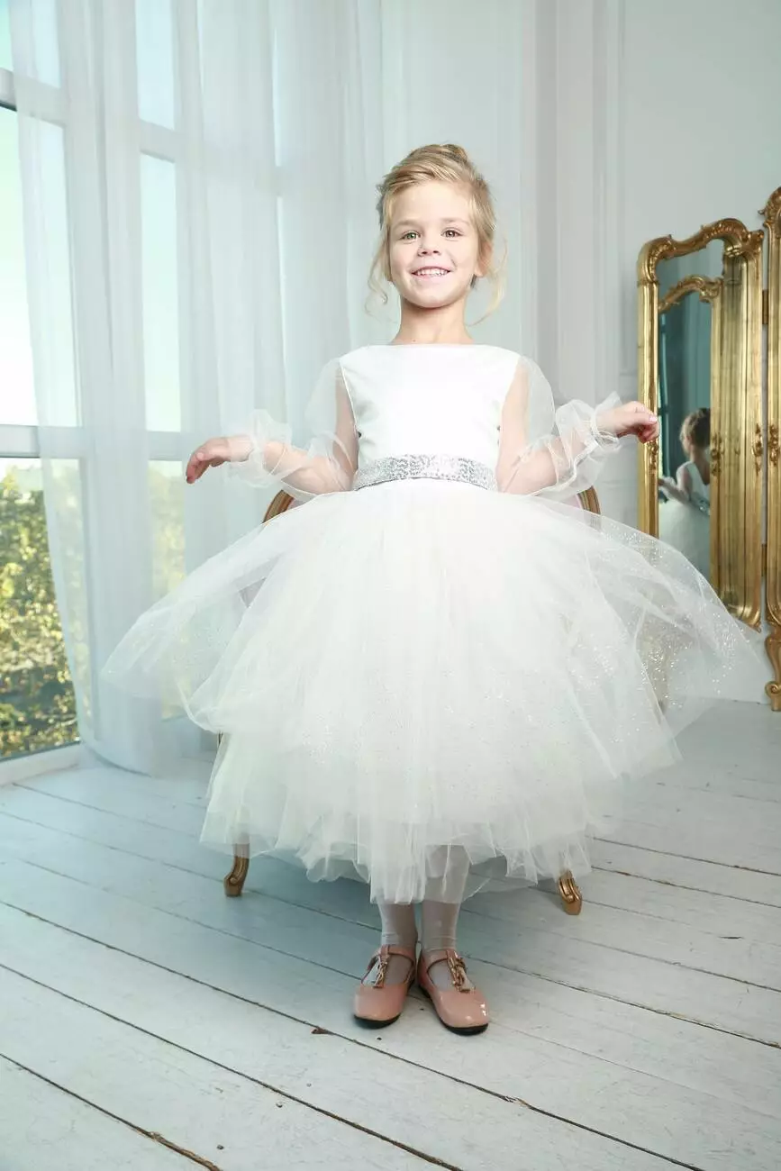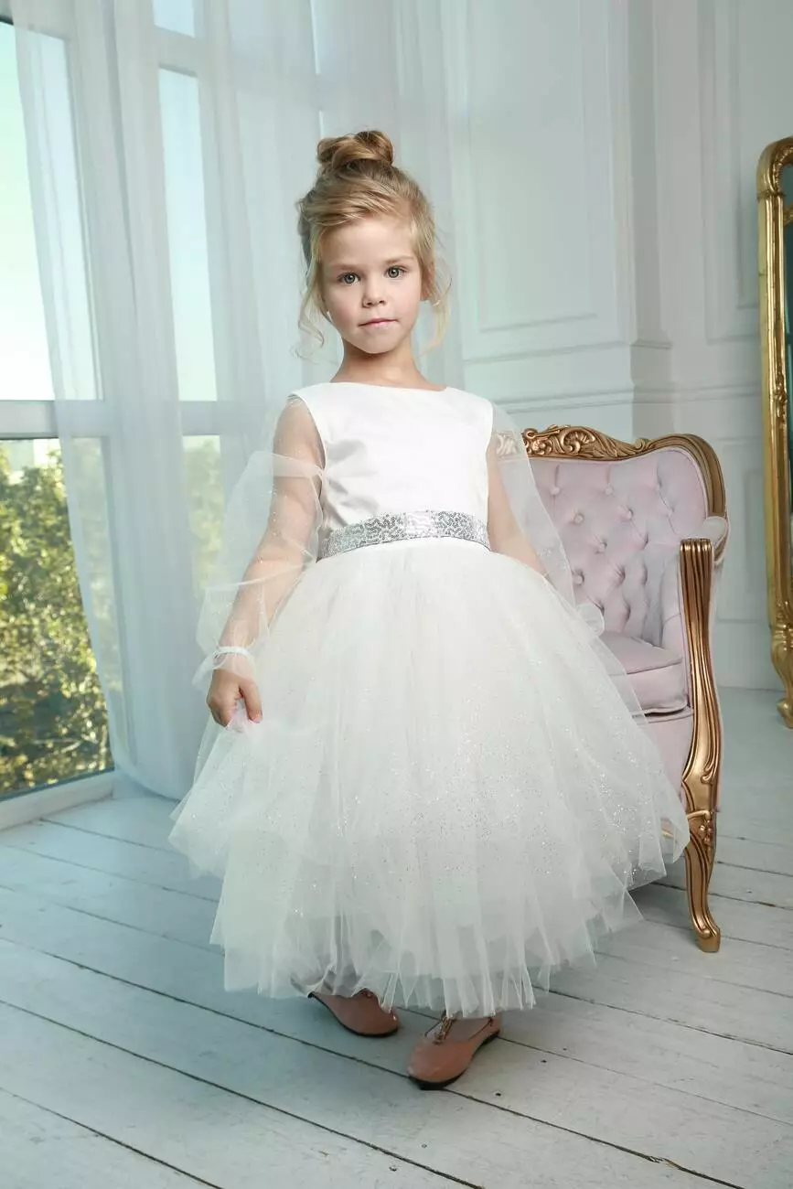 Деталі моделі: Плаття білого кольору. Пишна фатинова спідниця в п'ять шарів. Довгі рукава з фатину. Срібний пояс в пайєтку з ошатним бантом ззаду. Довжина сукні - нижче колін. Застібка - блискавка на спинці. Підкладка - коттон.