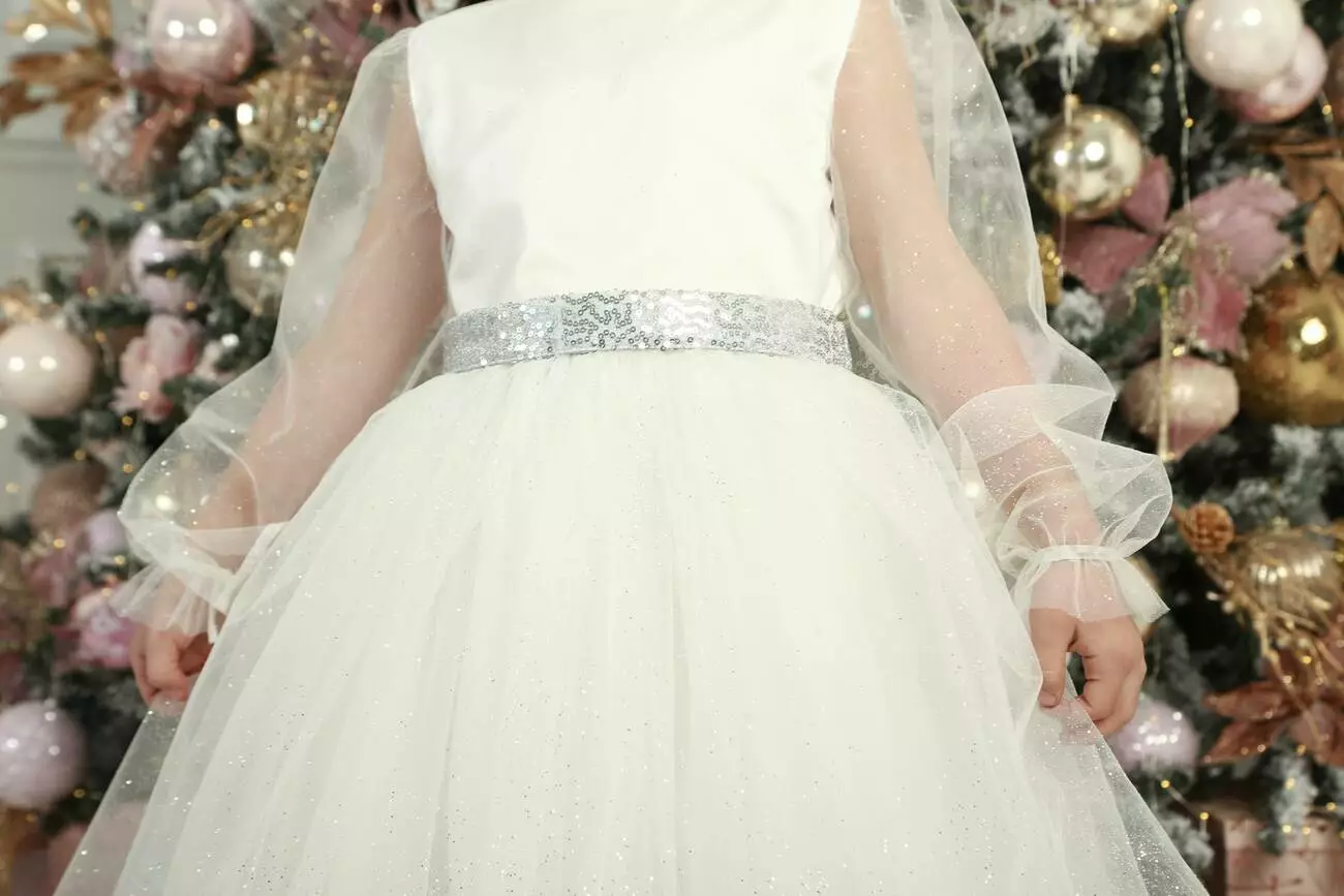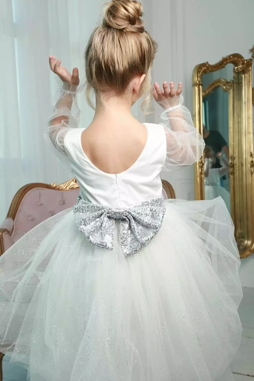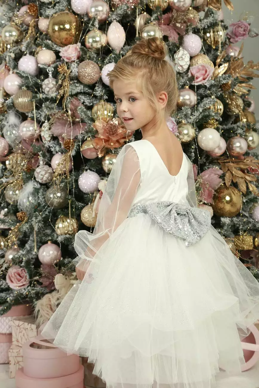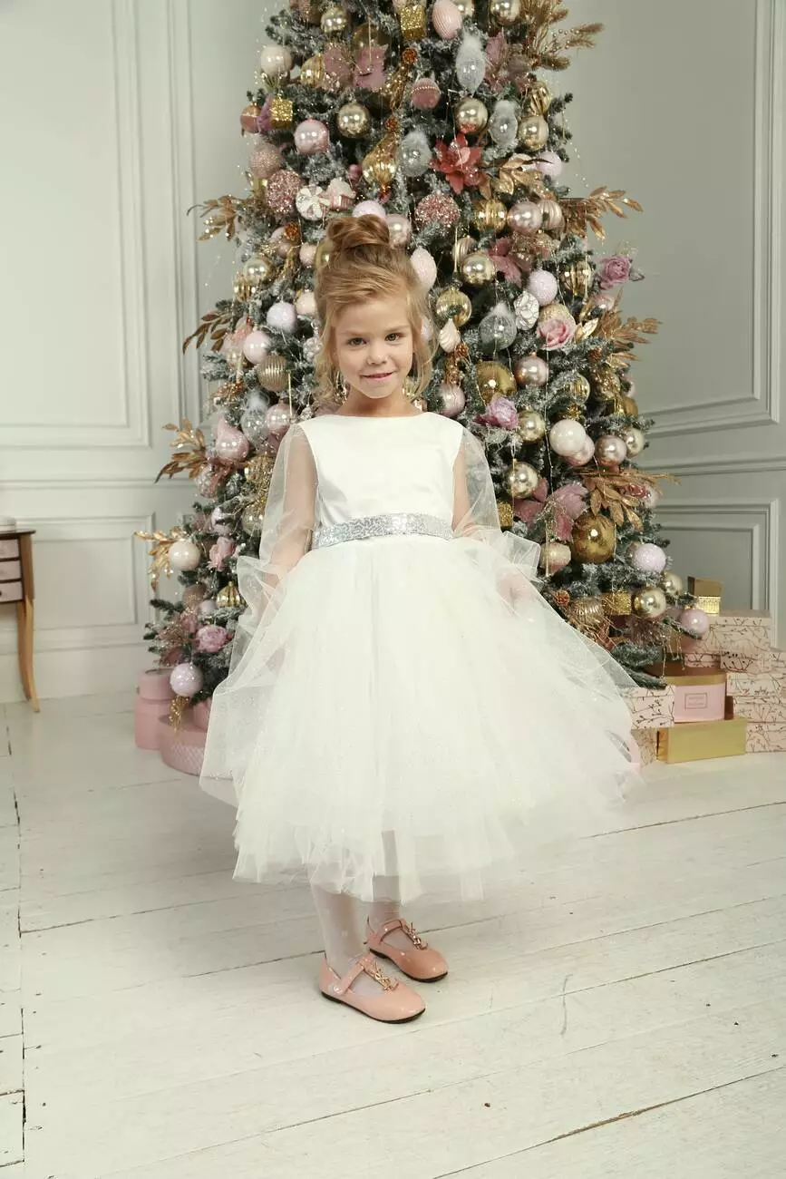 Деталі моделі: Плаття білого кольору. Пишна фатинова спідниця в п'ять шарів. Довгі рукава з фатину. Срібний пояс в пайєтку з ошатним бантом ззаду. Довжина сукні - нижче колін. Застібка - блискавка на спинці. Підкладка - коттон.