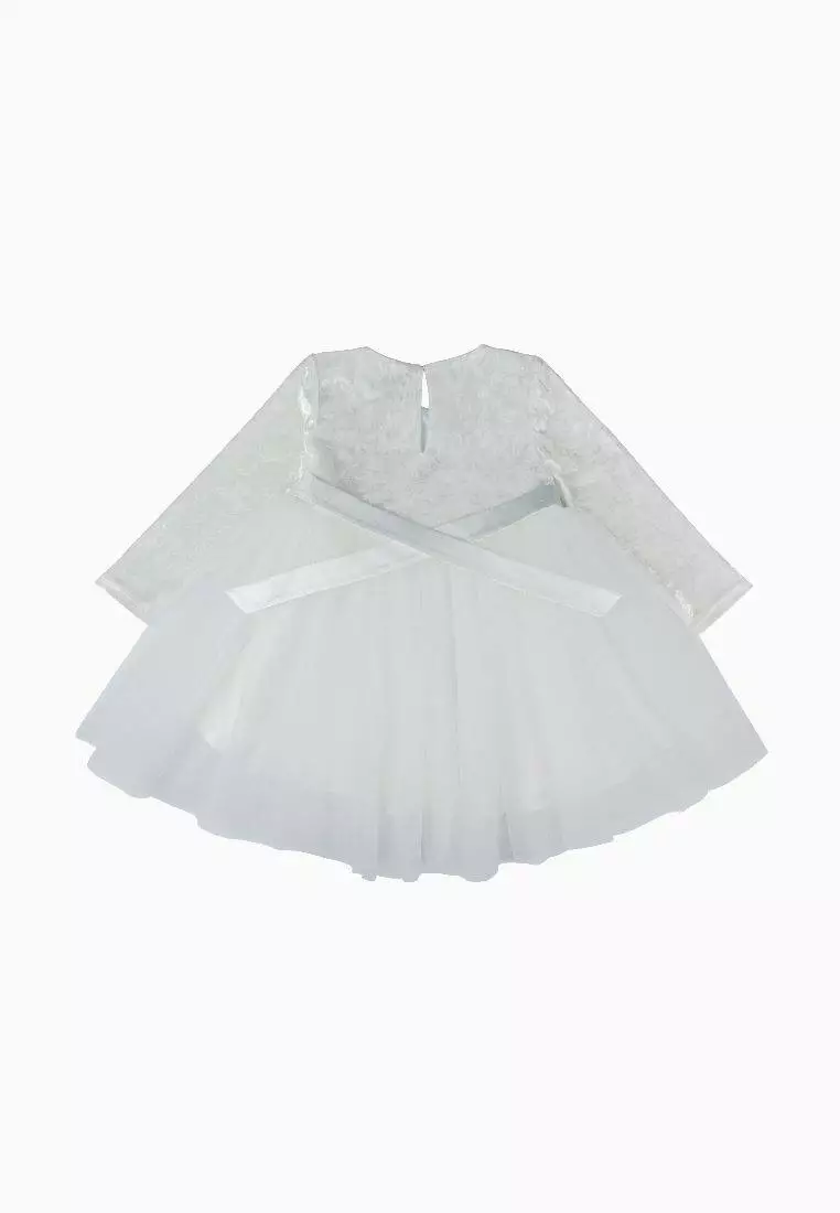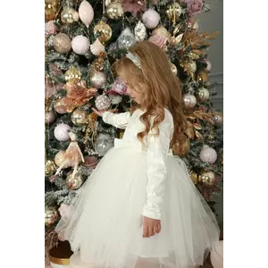 Деталі моделі: Довжина плаття - до колін. Колір - молочний. Довгий рукав. Висока талія. Верх - якісний велюр. Спідниця пишна в чотири шари фатину. На поясі - декоративний бант. Застібка - ззаду на гудзику.Рекомендації за доглядом: машинне прання при температурі 30 градусів.