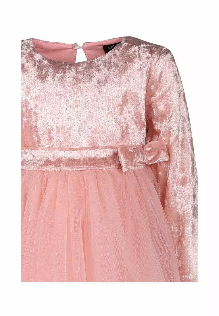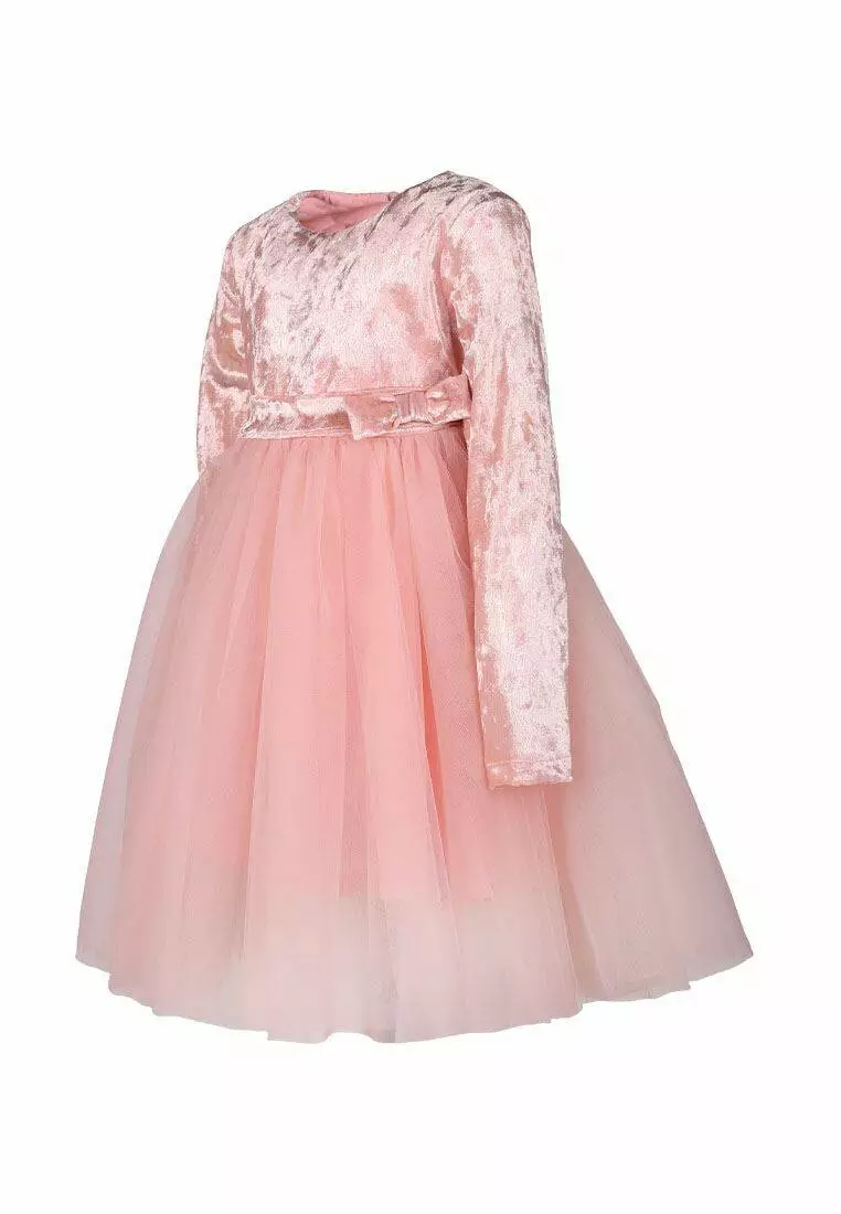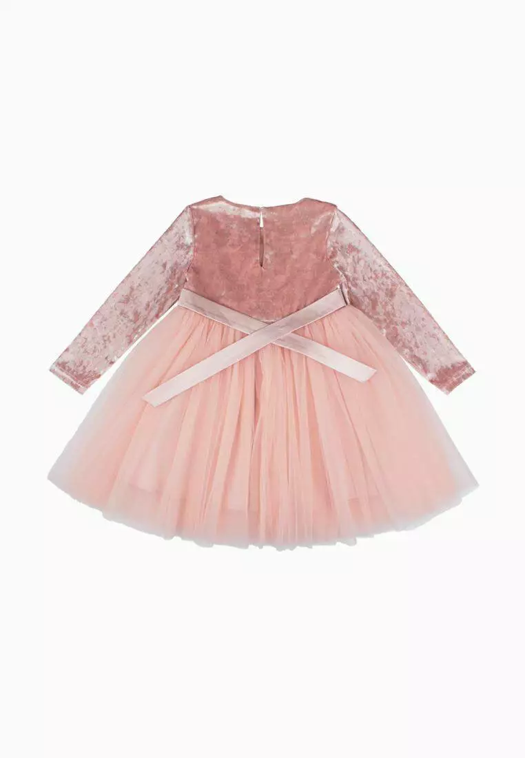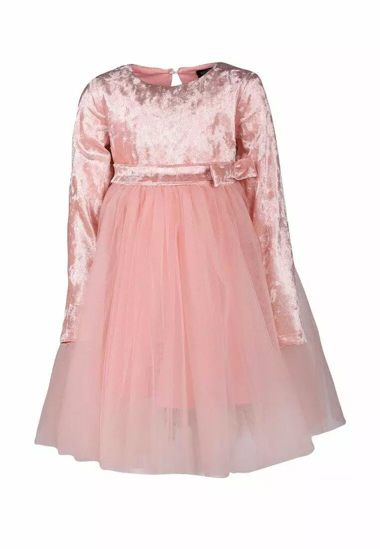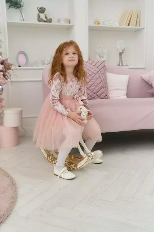 Деталі моделі: Довжина плаття - до колін. Колір - пудровий. Довгий рукав. Висока талія. Верх - якісний велюр. Спідниця пишна в чотири шари фатину. На поясі - декоративний бант. Застібка - ззаду на гудзику.Рекомендації за доглядом: машинне прання при температурі 30 градусів.