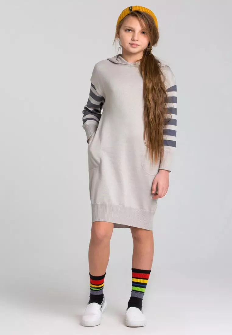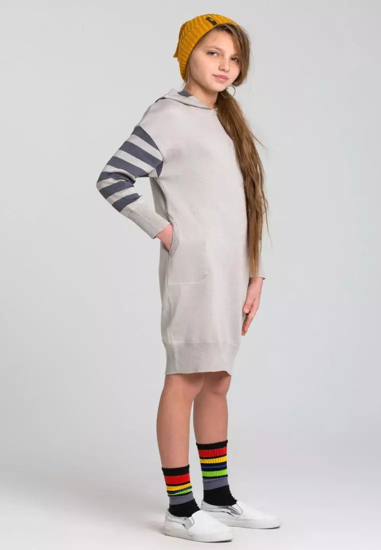 Зручне трикотажне плаття з заниженою лінією плеч і капюшоном. Для дівчаток від 5 до 15 років.