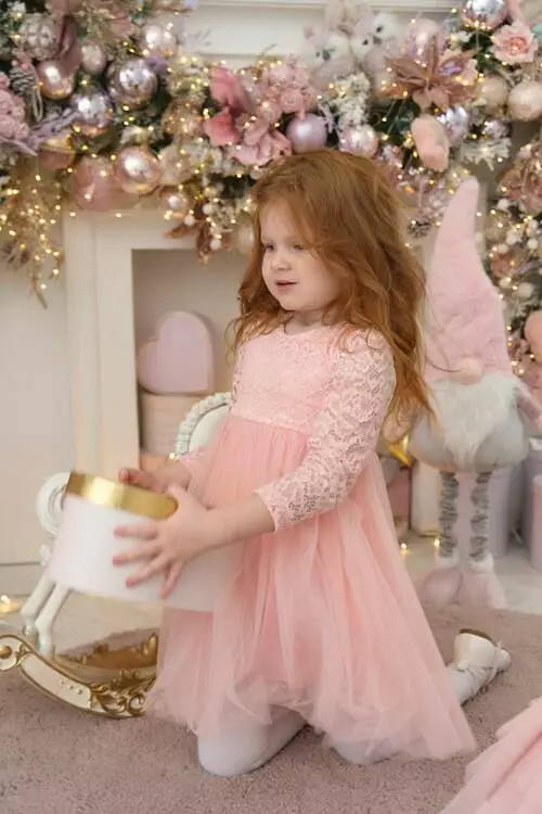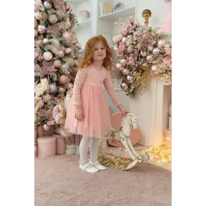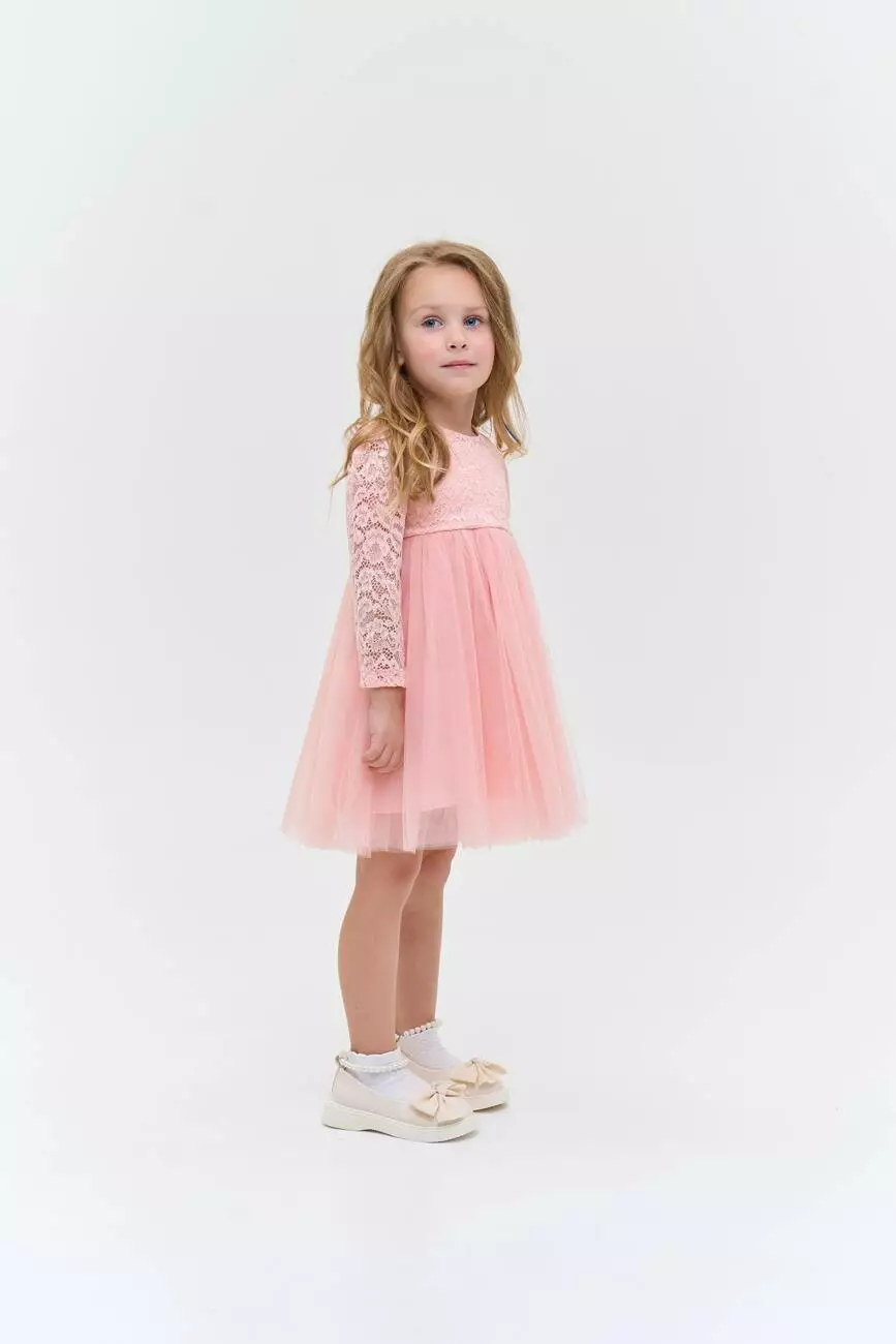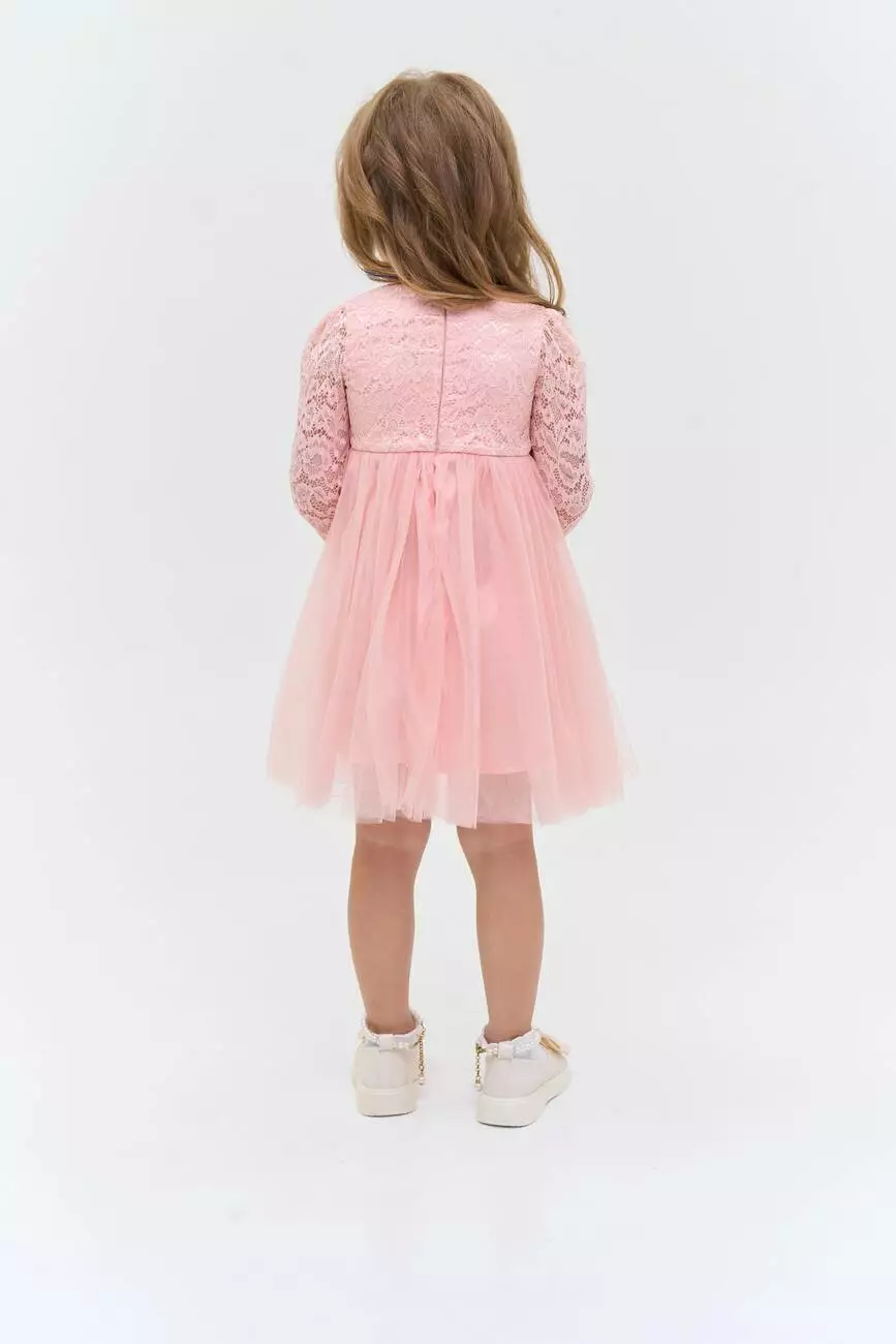 Деталі моделі: Сукня пудрового кольору. Верх сукні виконаний із якісного гіпюру, Підкладка бавовняна. Кругла горловина. Довгий рукав. Застібка – блискавка на спинці. Спідниця пишна виконана із двох шарів фатину. Третій, нижній шар спідниці - із атласу. Сукня добре тримає форму. Довжина виробу – по коліно. Розмірний ряд: на зріст від 80 см до 104 смСклад: 50% віскоза, 50% поліестер
