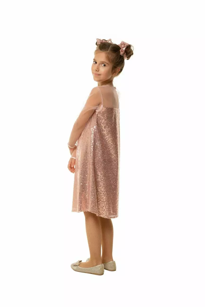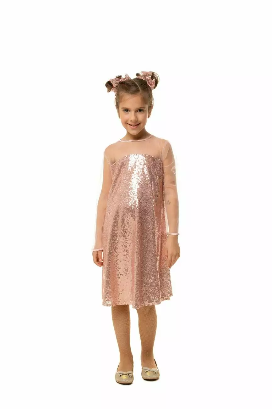 Деталі моделі: Сукня пудрового кольору. Вся сукня оформлена дрібними паєтками. Плечі і рукава - з якісної сітки. Горловина і манжети обрамлені чорною окантовкою з атласу.Рекомендації за доглядом: машинне прання при температурі 30 градусів.