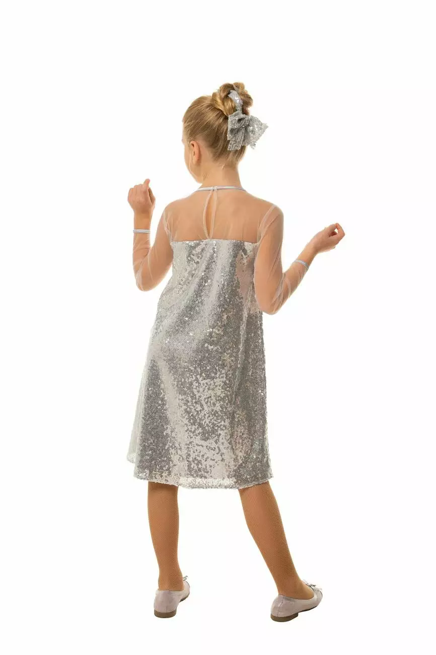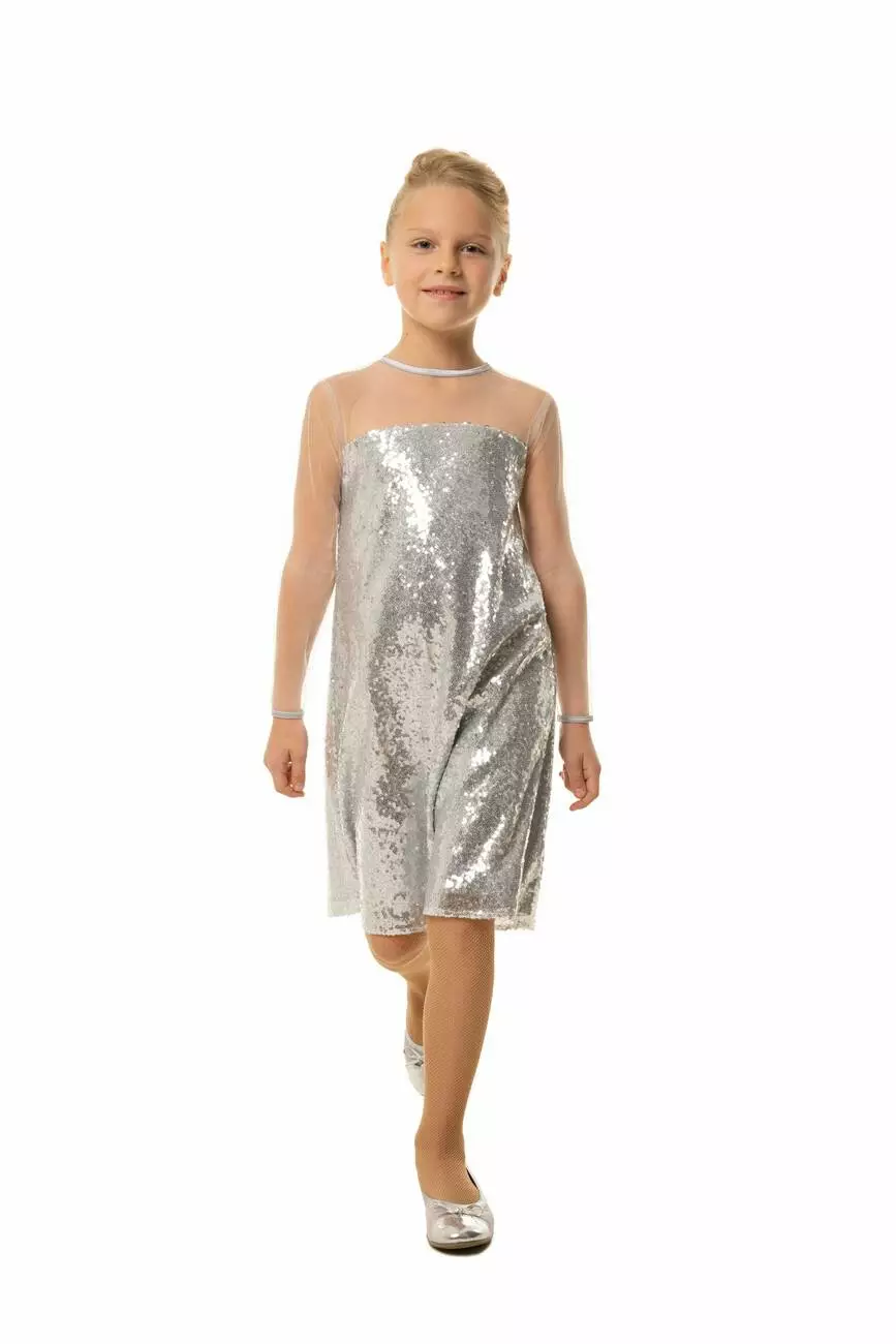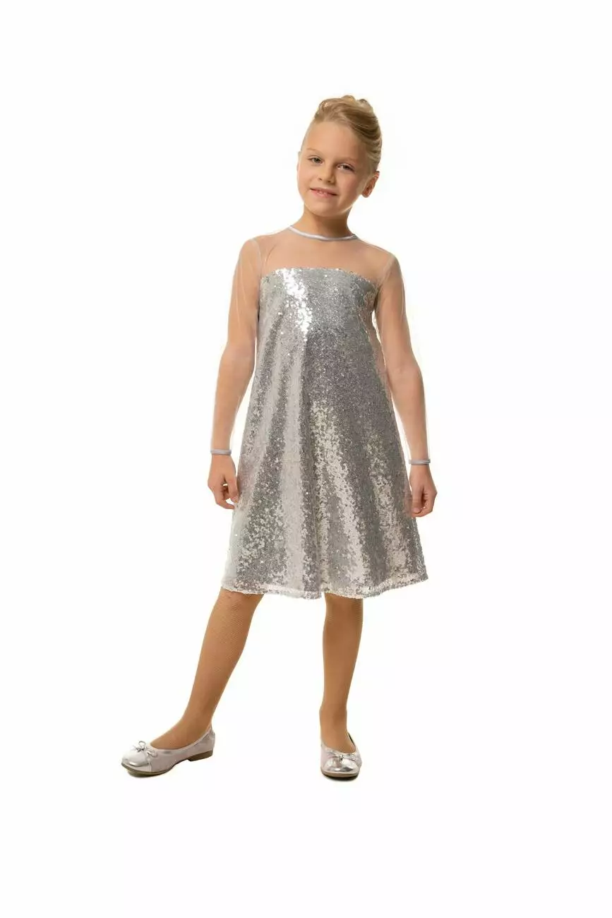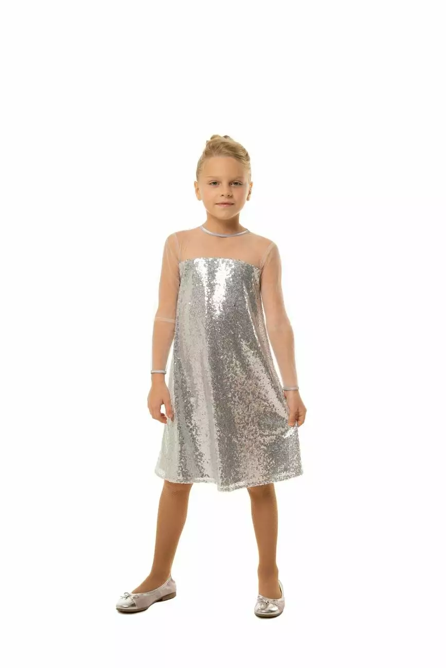 Деталі моделі: Сукня срібного кольору. Вся сукня оформлена дрібними паєтками. Плечі і рукава - з якісної сітки. Горловина і манжети обрамлені чорною окантовкою з атласу.Рекомендації за доглядом: машинне прання при температурі 30 градусів.