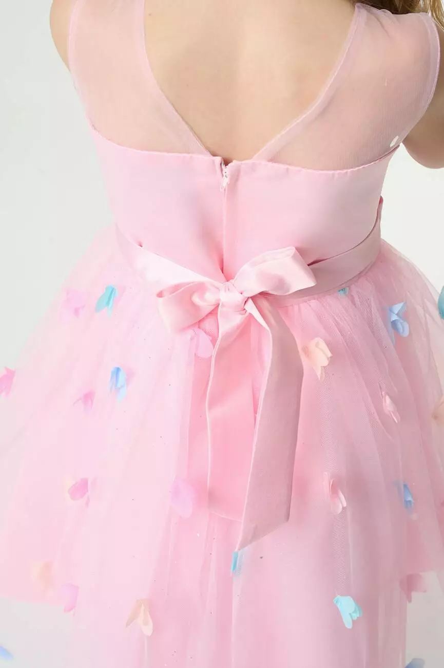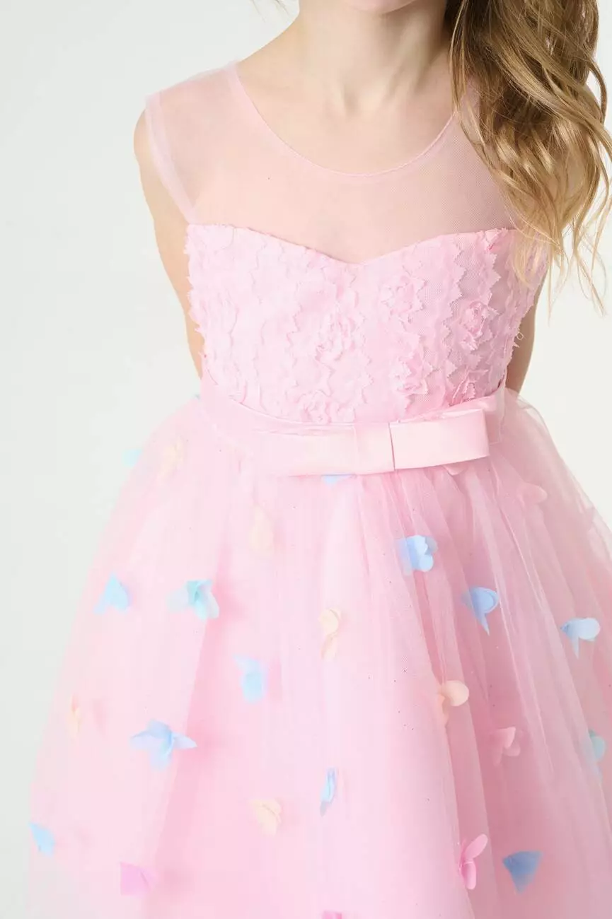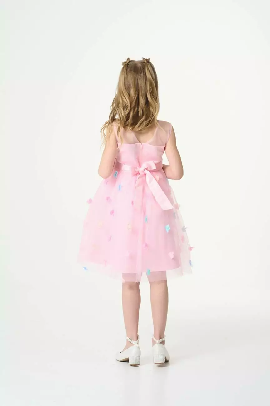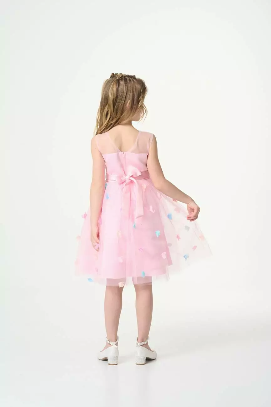 Деталі моделі: колір сукні – ніжно-рожевий. Кругла горловина. Без рукавів. Верх топа – відрізна кокетка з євросітки. Застібка – блискавка на спинці. Ліф сукні прикрашений трояндами в тон. Атласний пояс має спереду фіксований бант, а ззаду зав'язується на бант. Нижній шар спідниці – непрозора тканина. Верхній шар спідниці – євросітка, декорована кольоровими квіточками. Довжина сукні – до колін.