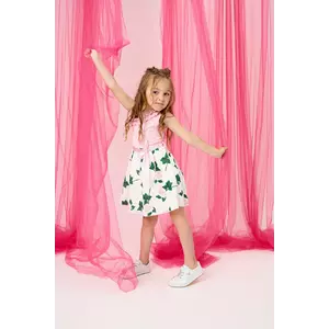 Деталі моделі: топ сарафану ніжно-рожевого кольору. Одне відкрите плече. Без застібок. Пояс оздоблений атласною стрічкою з бантом. Біла спідниця вільного крою з принтом великих троянд. Довжина сарафану – до колін. У комплекті із сарафаном маленька сумочка, на ланцюжку.