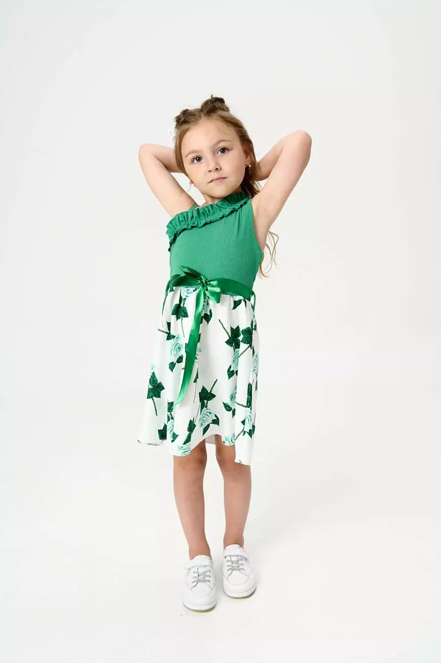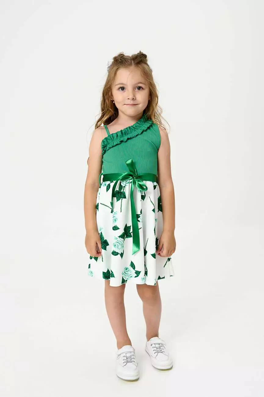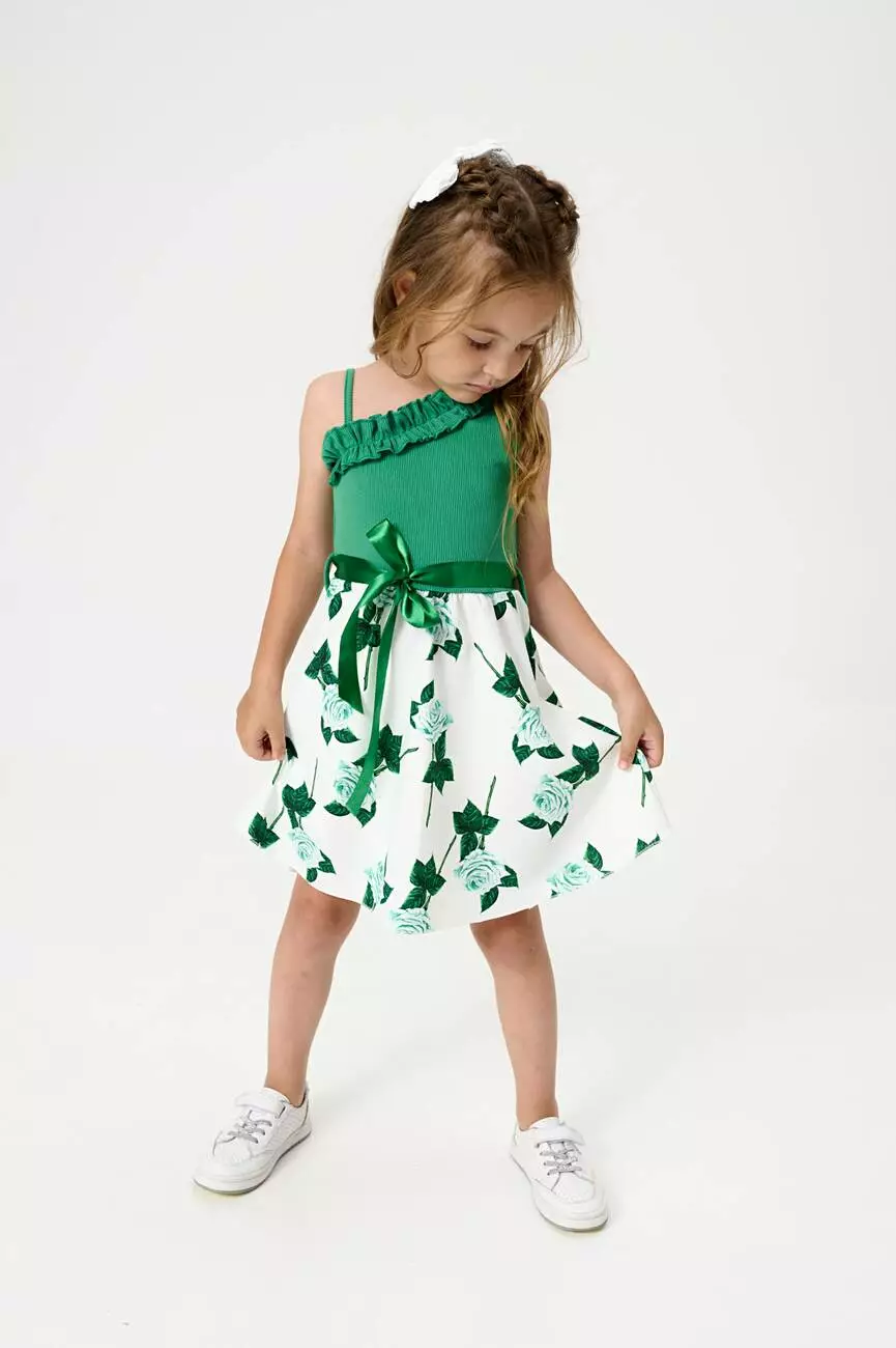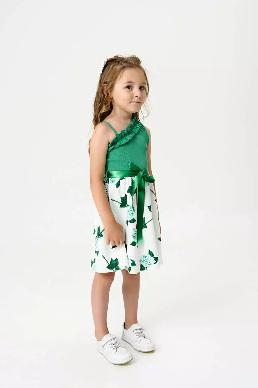 Деталі моделі: топ сарафану зеленого кольору. Одне відкрите плече. Без застібок. Пояс оздоблений атласною стрічкою з бантом. Біла спідниця вільного крою з принтом великих троянд. Довжина сарафану – до колін. У комплекті із сарафаном маленька сумочка, на ланцюжку.