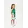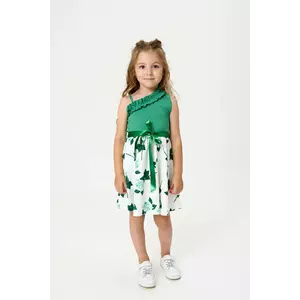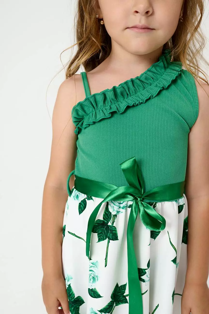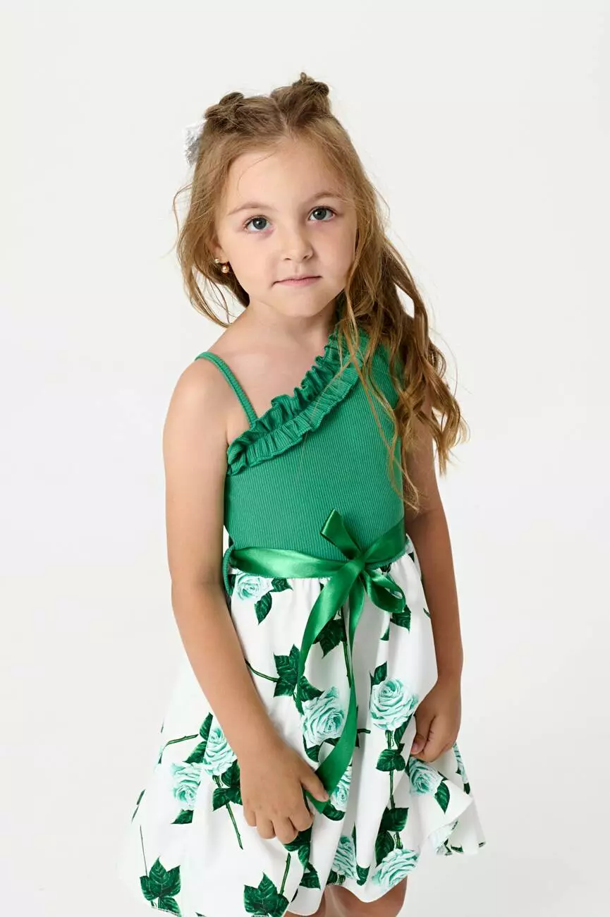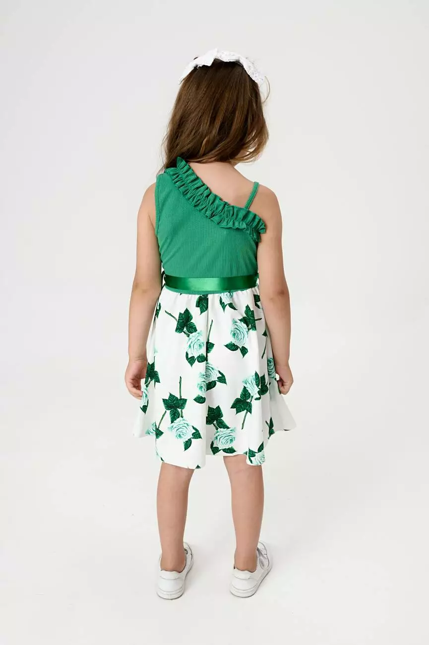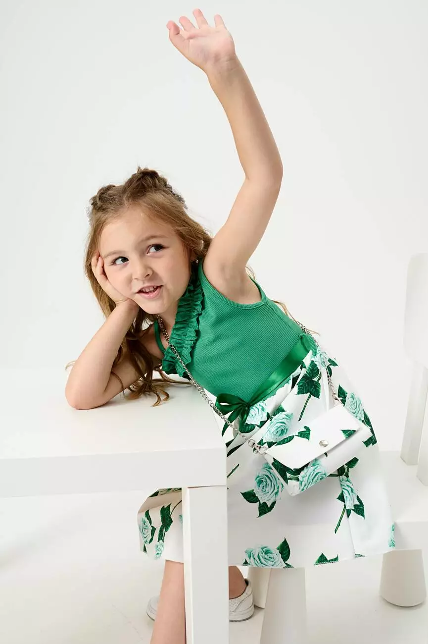 Деталі моделі: топ сарафану зеленого кольору. Одне відкрите плече. Без застібок. Пояс оздоблений атласною стрічкою з бантом. Біла спідниця вільного крою з принтом великих троянд. Довжина сарафану – до колін. У комплекті із сарафаном маленька сумочка, на ланцюжку.