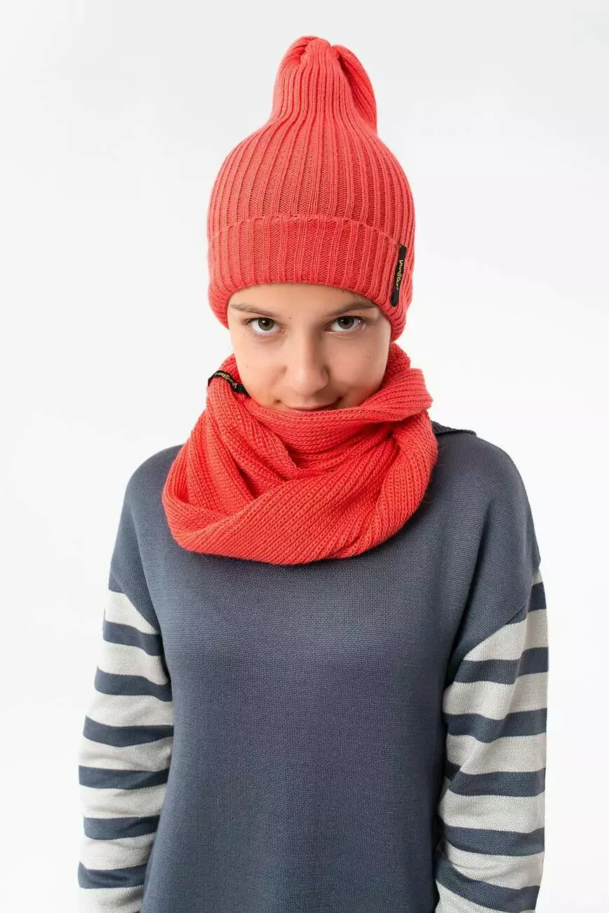 Шапка коралового кольору. Для дівчат від 5 до 15 років. Шапка виконана з м'якою пряжі, яка не кусається і дуже приємна на дотик. Завдяки своїй подовженій формі, виріб не тисне і не псує зачіску.